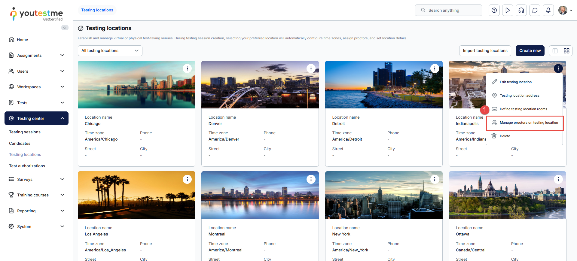 - To assign proctors, click the three dots and select Manage proctors for the testing location.