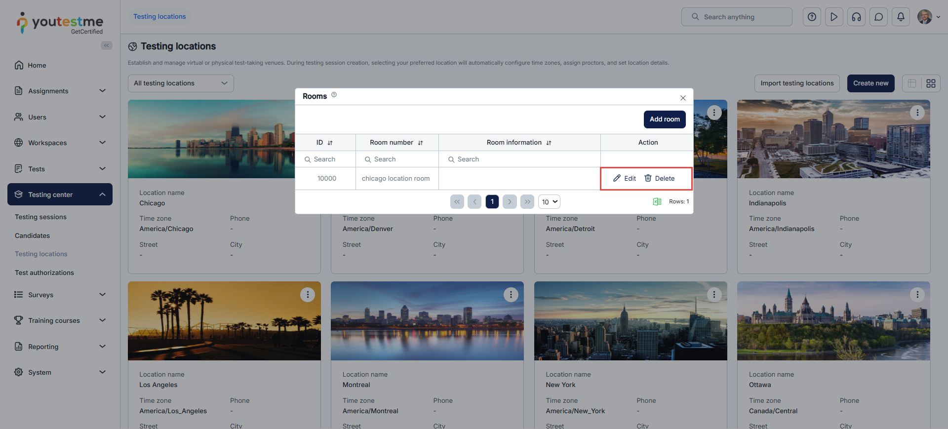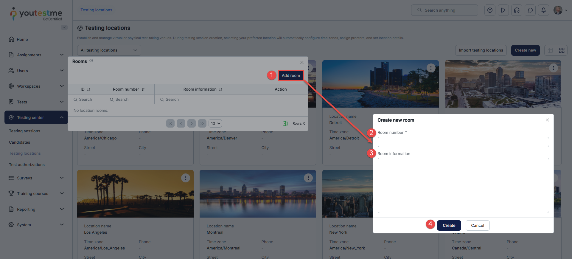 - Define testing location rooms