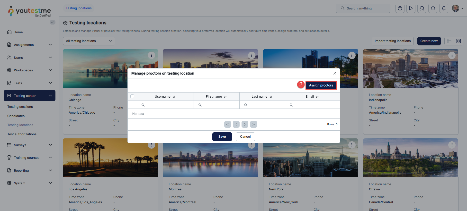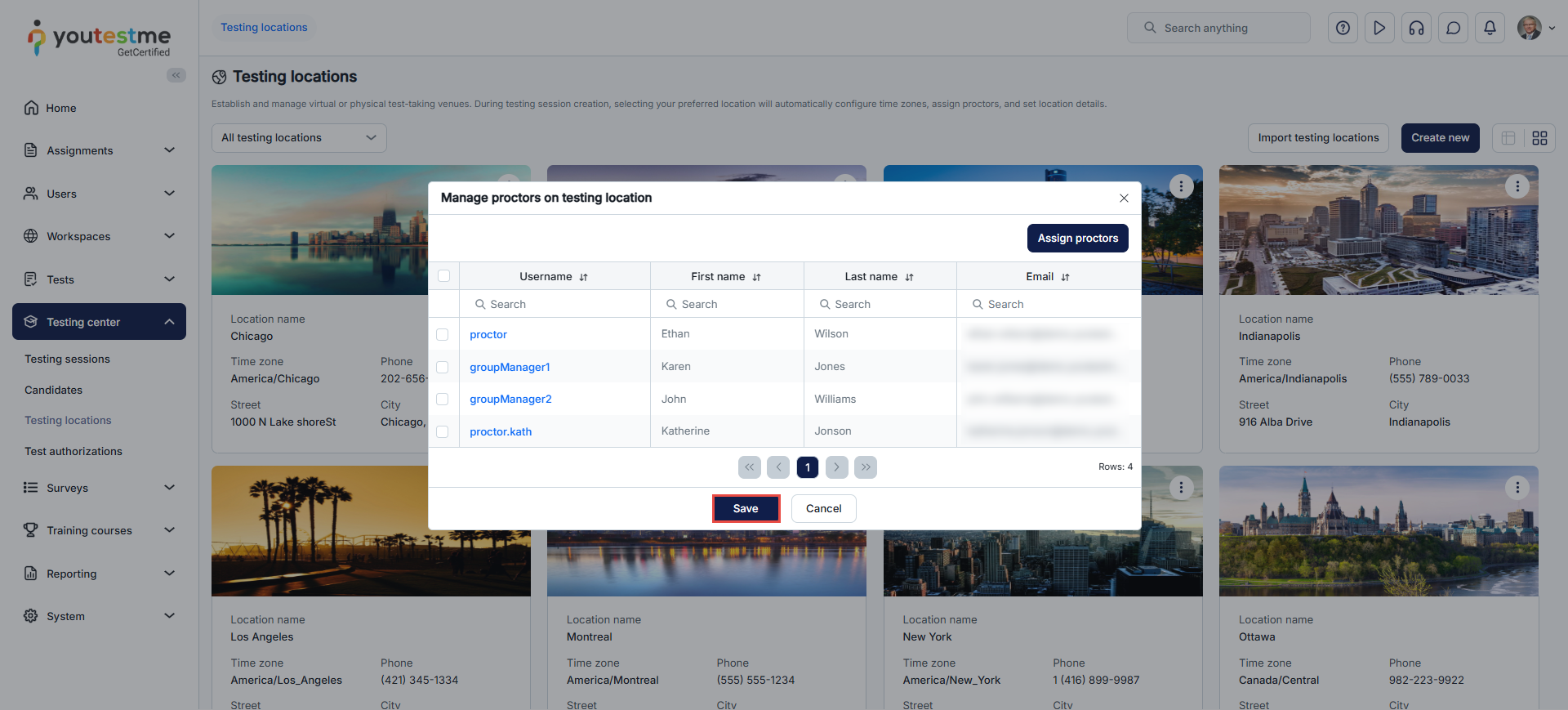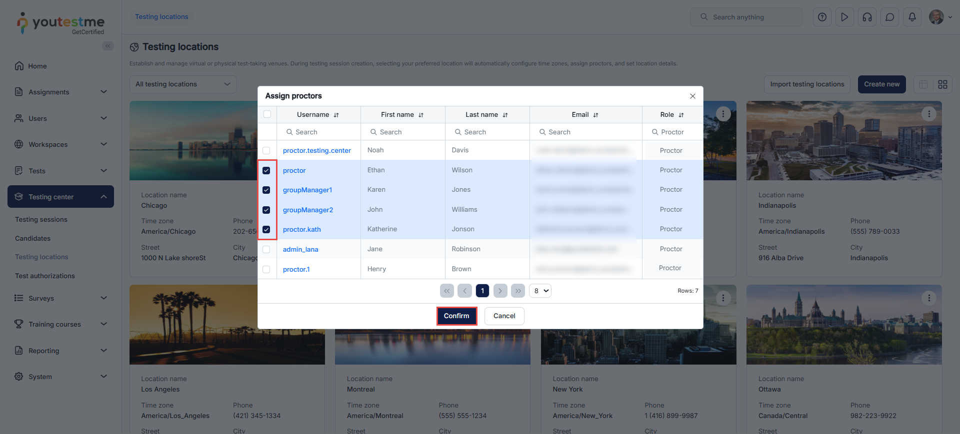 - Click the Assign proctors button and select the proctors you want to assign to the location in the pop-up dialog by marking the checkbox next to each proctor’s username. Afterward, click the Confirm button.
