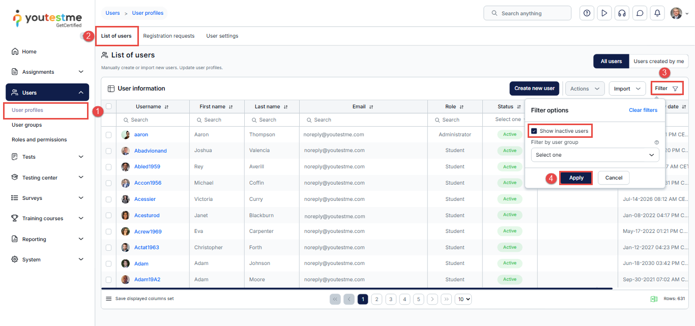 Note: Inactive user accounts are hidden by default. To view them, you must open the Filter and enable “Show inactive users.” Otherwise, inactive accounts will not appear in the list.