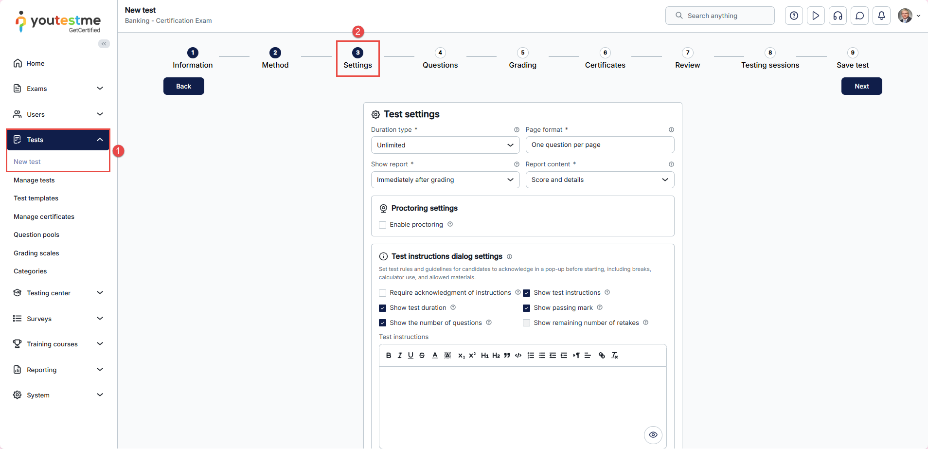 - In the test creation wizard, navigate to the third step, Settings, and click Show advanced settings.