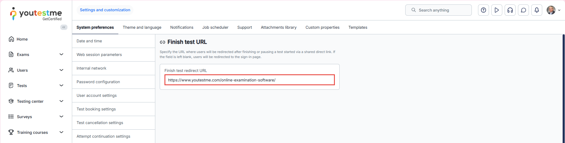 This article explains how to configure the Finish Test URL, which is the web page candidates are redirected to after completing a test. Configuring this option allows organizations to control the post-exam experience, for example, redirecting candidates to a company website, instructions page, or next steps, helping provide a smooth and guided workflow after test completion.