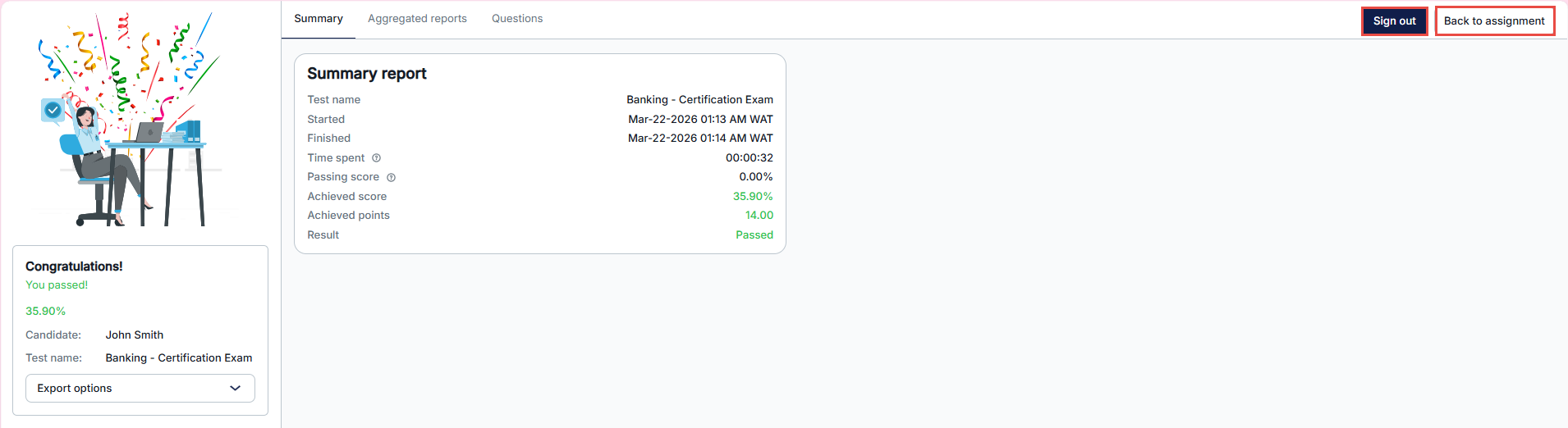 - Selecting Sign out will redirect them to the configured Finish Test URL.