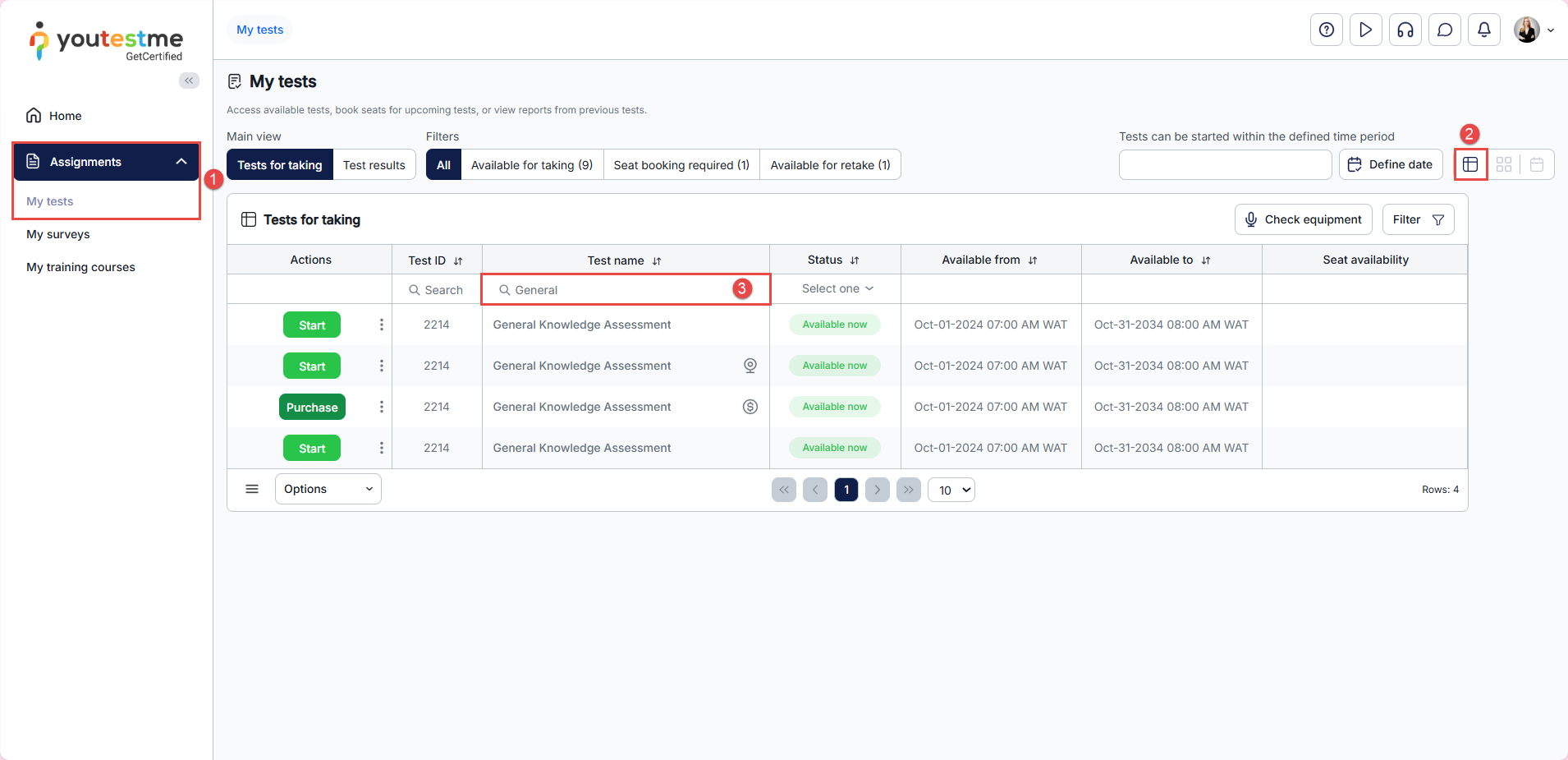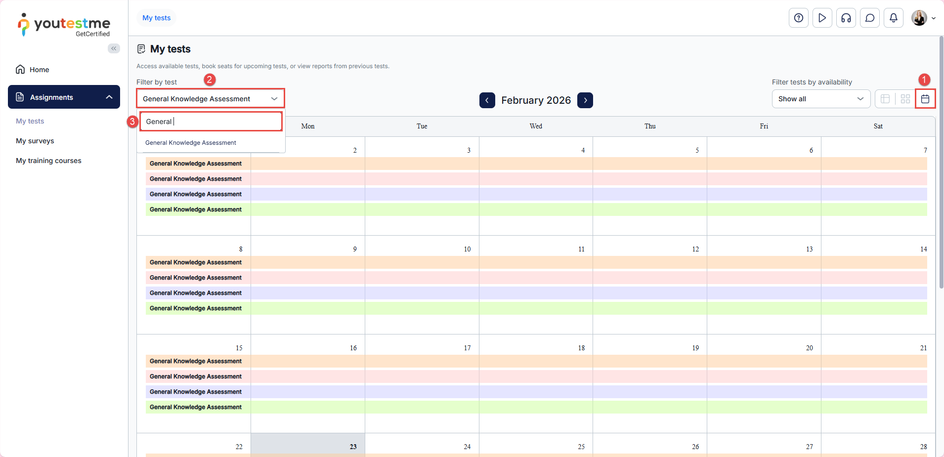 All matching assignments will be displayed on the calendar according to their scheduled dates. If a test includes multiple sessions, all available sessions for that test will be visible on the calendar.