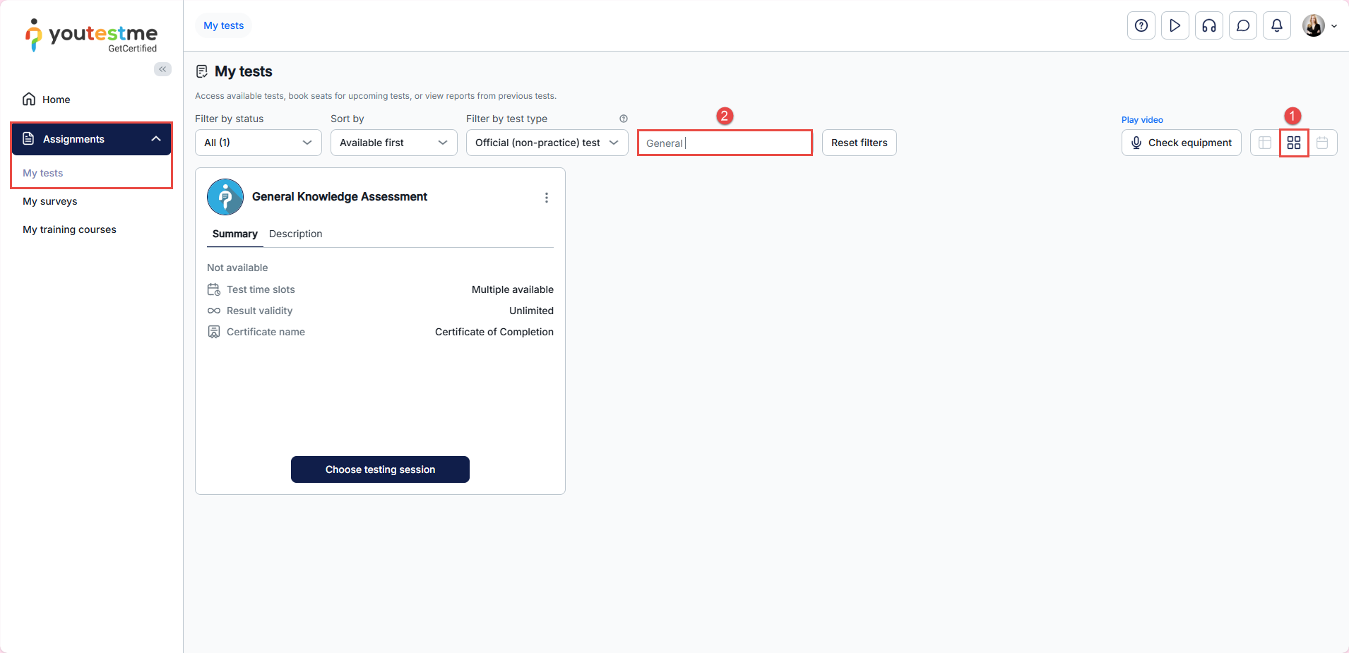 This article explains how to quickly locate your assigned tests, surveys, and training courses on the Assignments page.