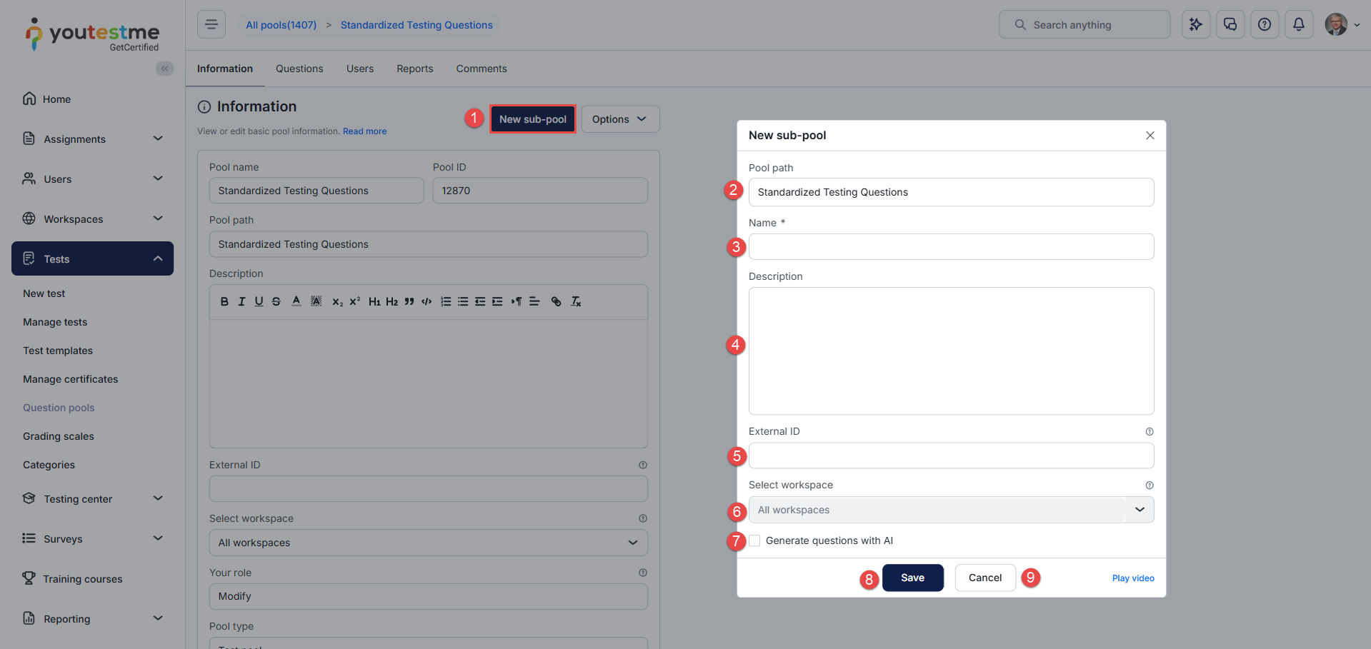 - Save the Pool: Click Save. If Generate Questions with AI is enabled, the system may take a few minutes to generate the questions.