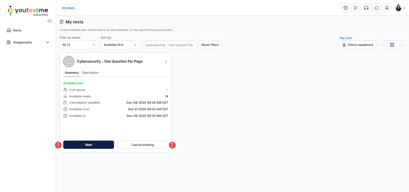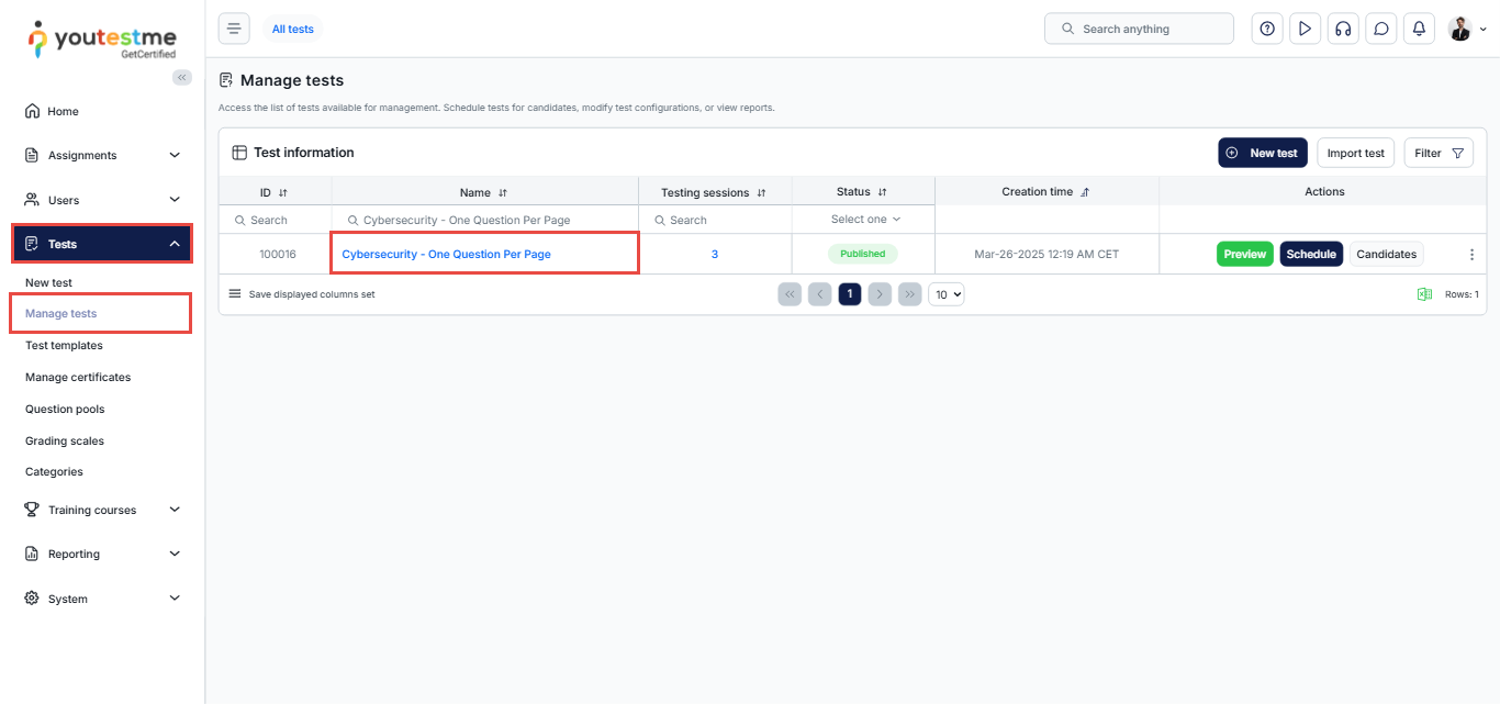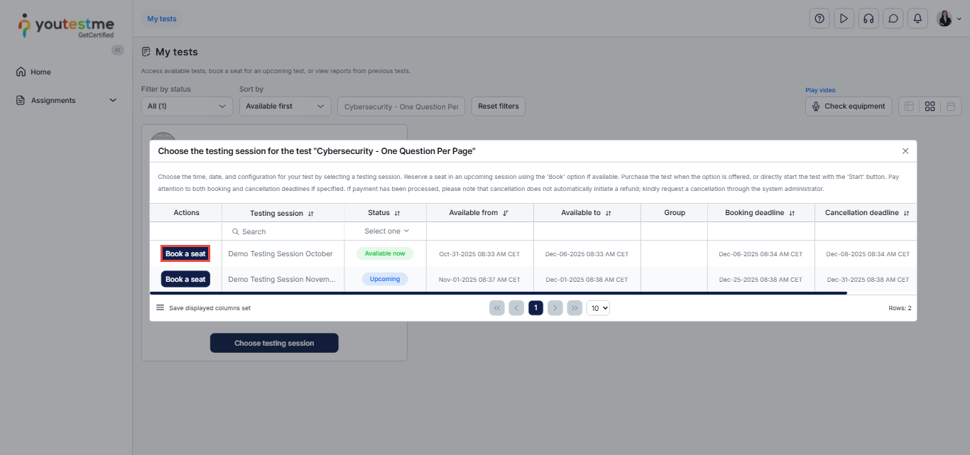 After logging in, you will be automatically redirected to the My Tests page, where you can use the search bar to find the “Cybersecurity- One Question Per Page” exam and then click the Choose testing session button to select a convenient time slot from the list of available testing sessions.