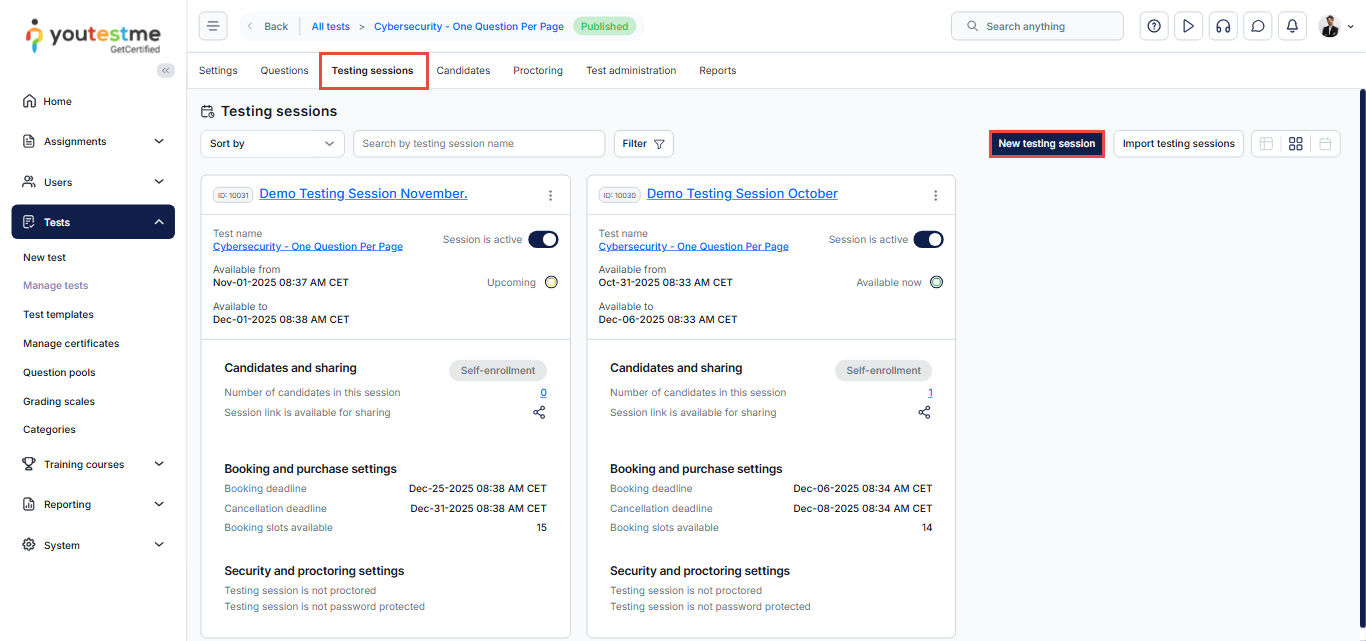YouTestMe allows administrators to make an exam available across different time slots using the Testing Sessions feature. Administrators can create multiple testing sessions for a single exam, enabling candidates to book the session that best suits their availability.