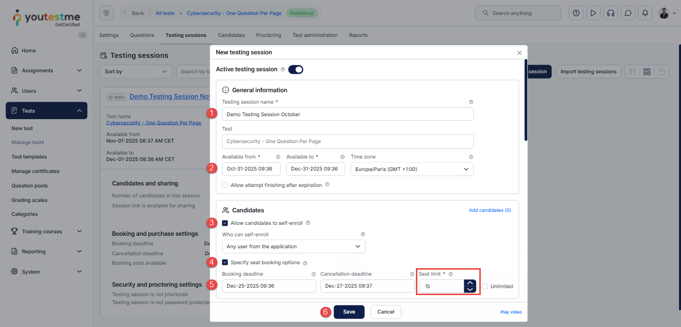 - You can limit the number of users booking this testing session. Settings include deadlines for booking and cancellation.