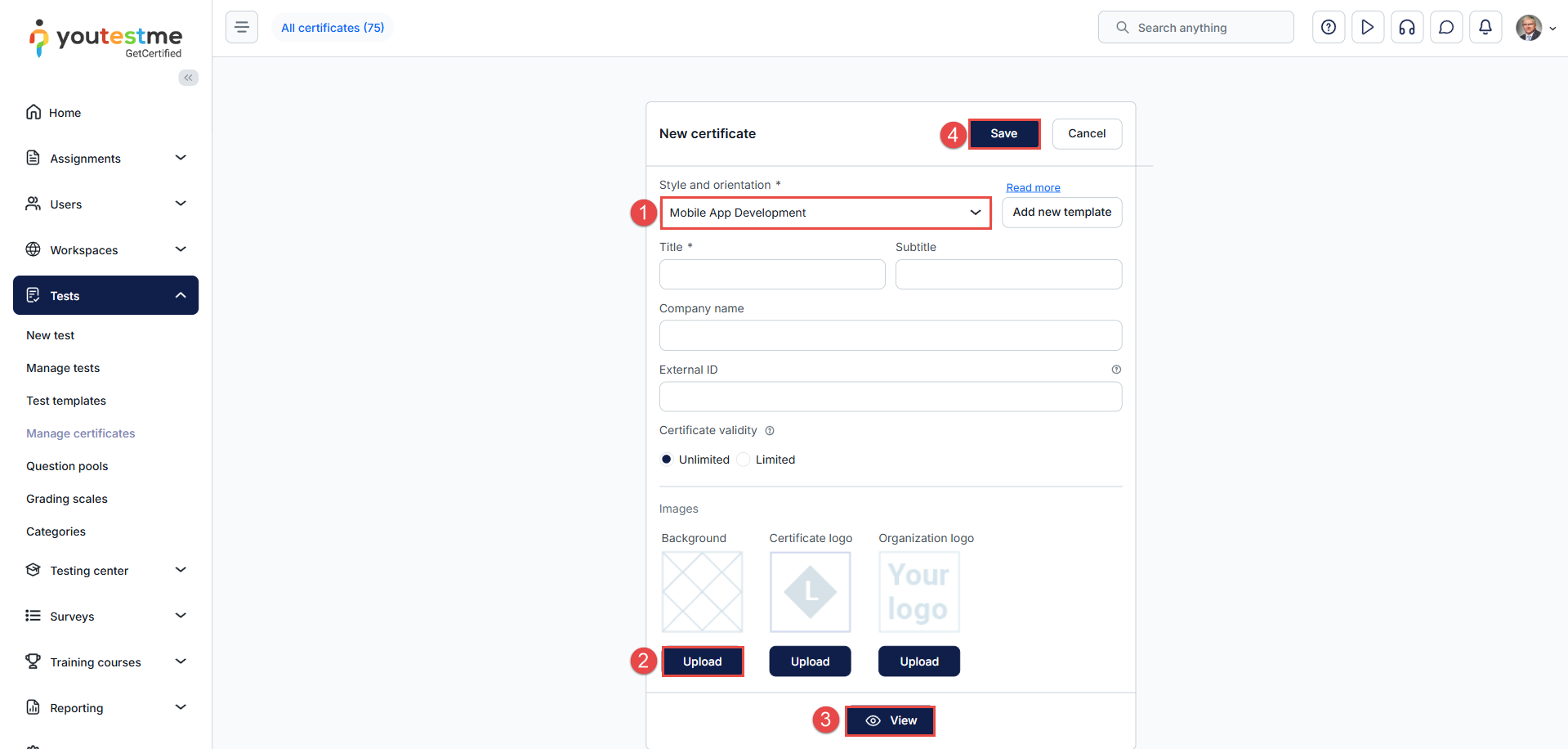 After adding the template, create a certificate from the Tests/Manage certificates tab: