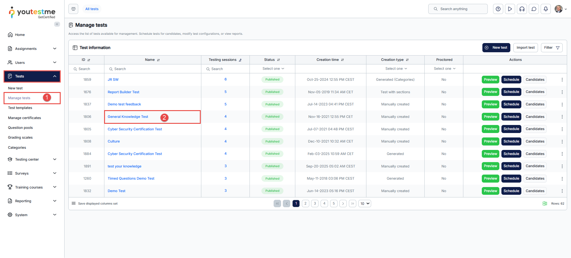 - In the main menu, select Tests and click the Manage Tests sub-module.