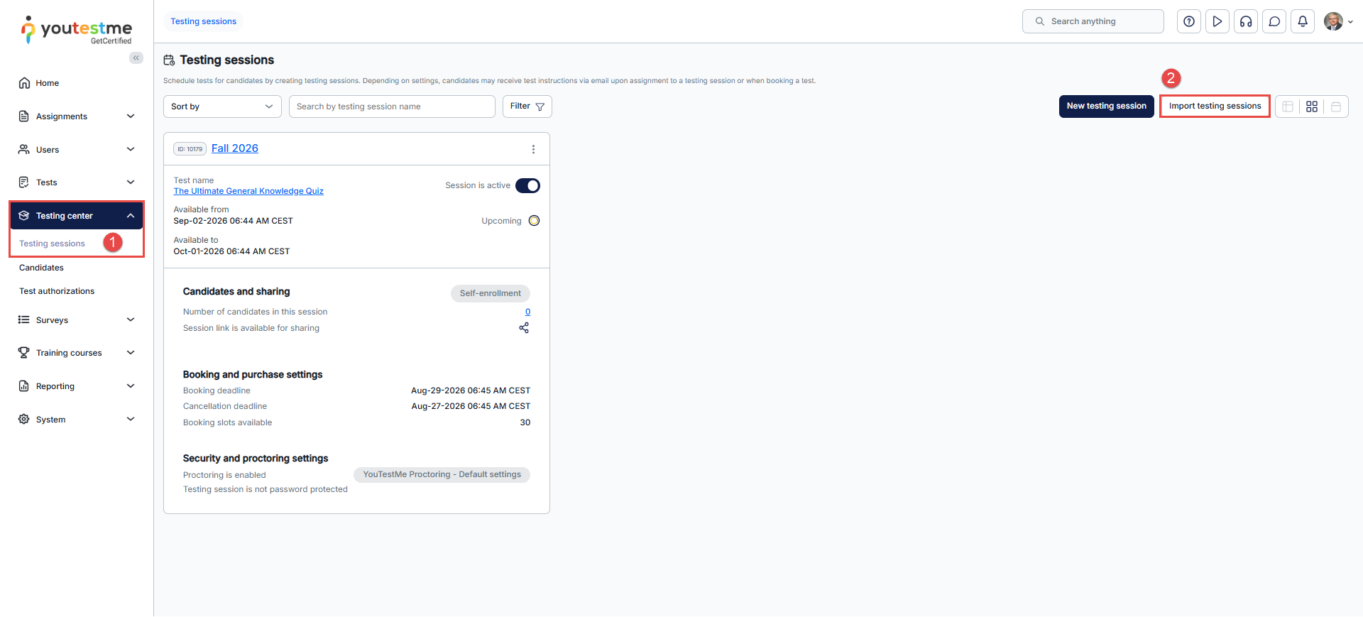 - In the main menu, click Testing Center, then navigate to Testing Sessions.