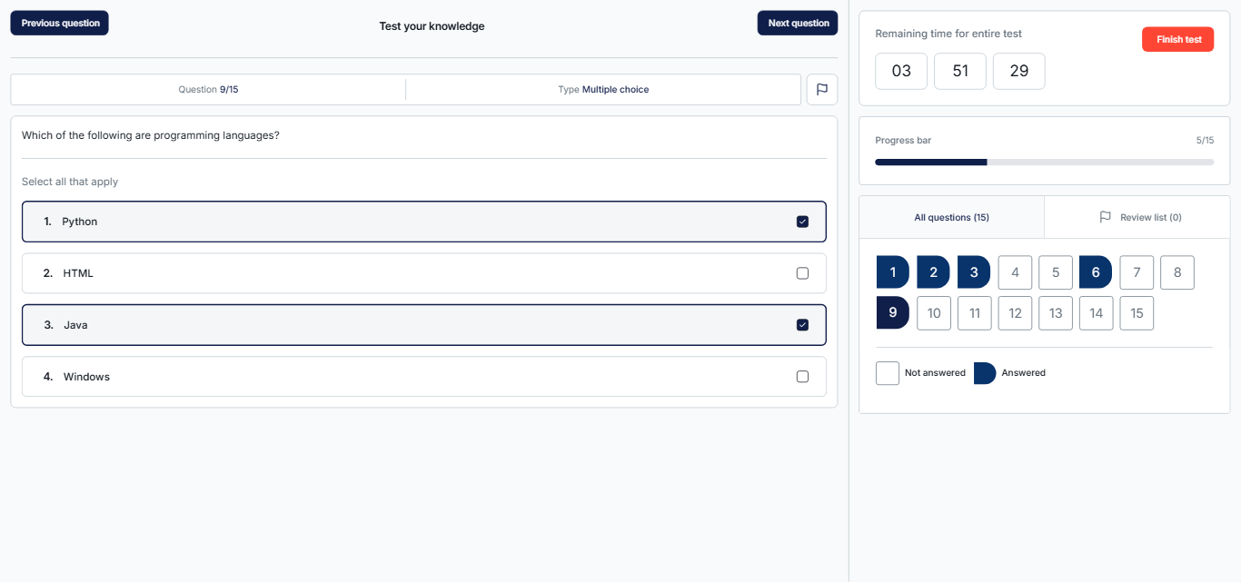 Note: If a candidate cannot see the list of questions, they can access it by clicking the hamburger menu in the top-left corner. Alternatively, they can try zooming out, as the system may adjust the layout of the exam page depending on the screen size.