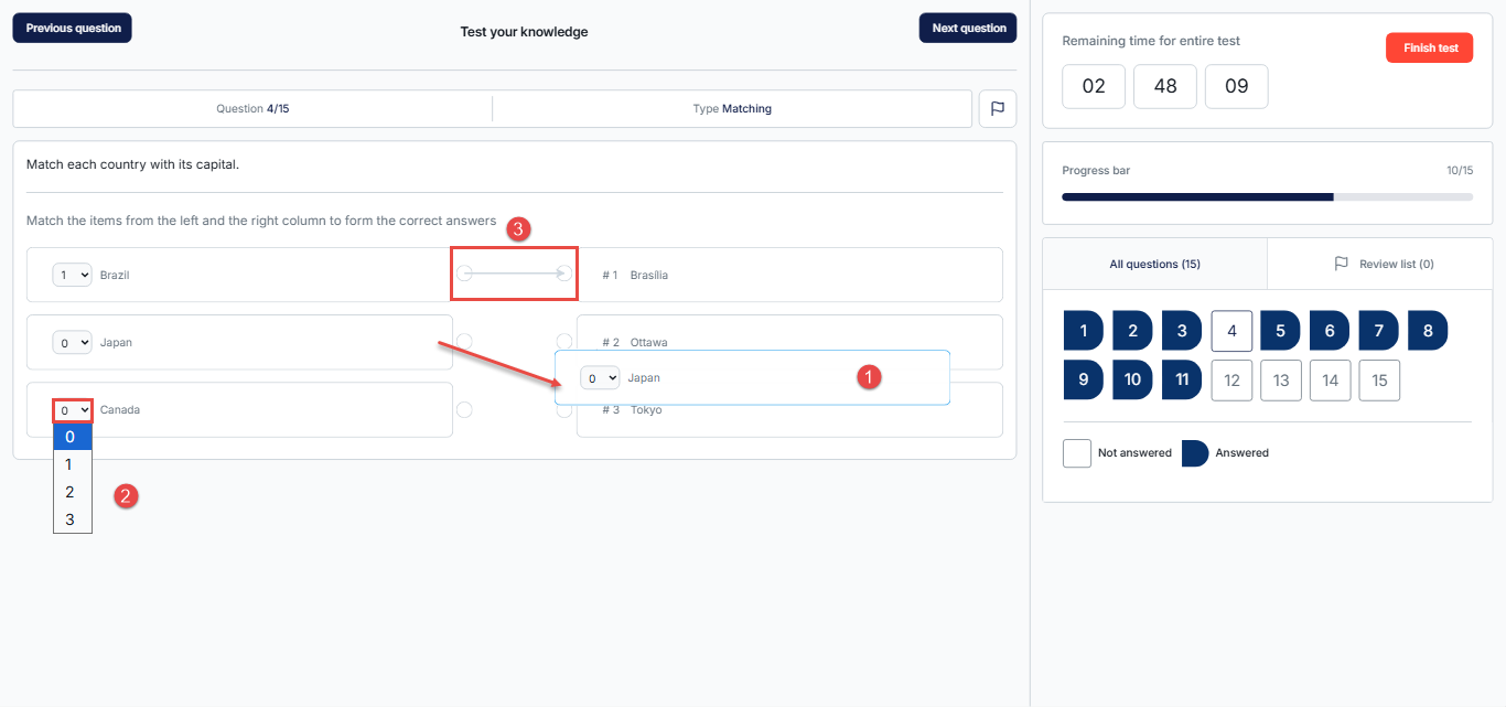 Matching questions require candidates to pair corresponding items from two lists. There are three ways to complete these questions: