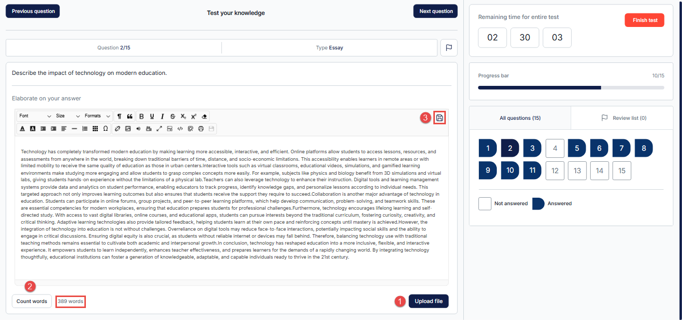 Essay questions require candidates to provide a detailed written response or upload a file. Depending on the question configuration, candidates can also answer the question by filling out a PDF document. These are the only question types that must be manually graded after the test is completed. For detailed information on how to answer an essay question, please visit this article.