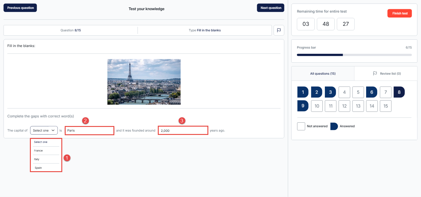Fill-in-the-blank questions require candidates to complete a sentence or statement by adding the missing phrase or value. There are three ways to fill in the blank: