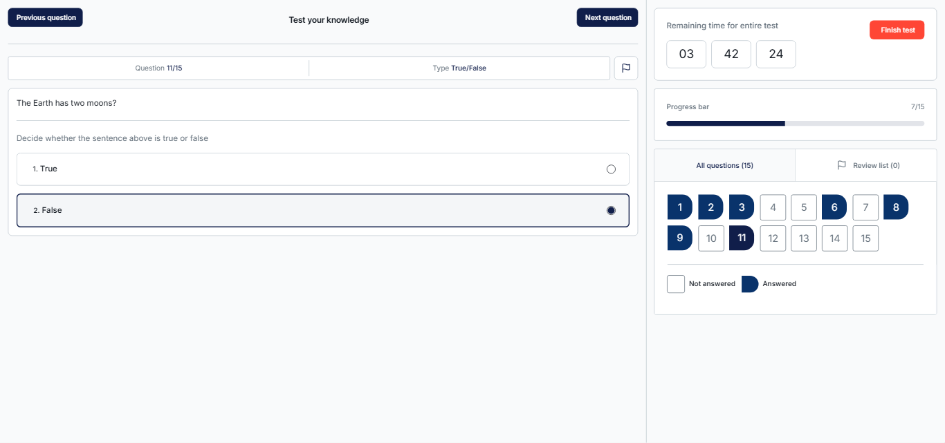 True/False questions consist of a single statement, and candidates must determine whether the statement is true or false.