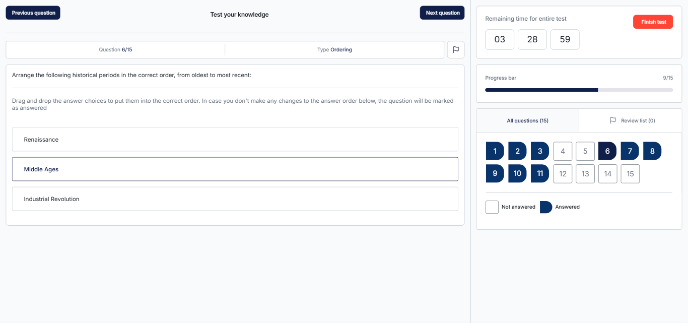 Ordering questions present a list of items in an incorrect sequence. Candidates must arrange them in the correct order by dragging and dropping. These are useful for chronological or process-based assessments.