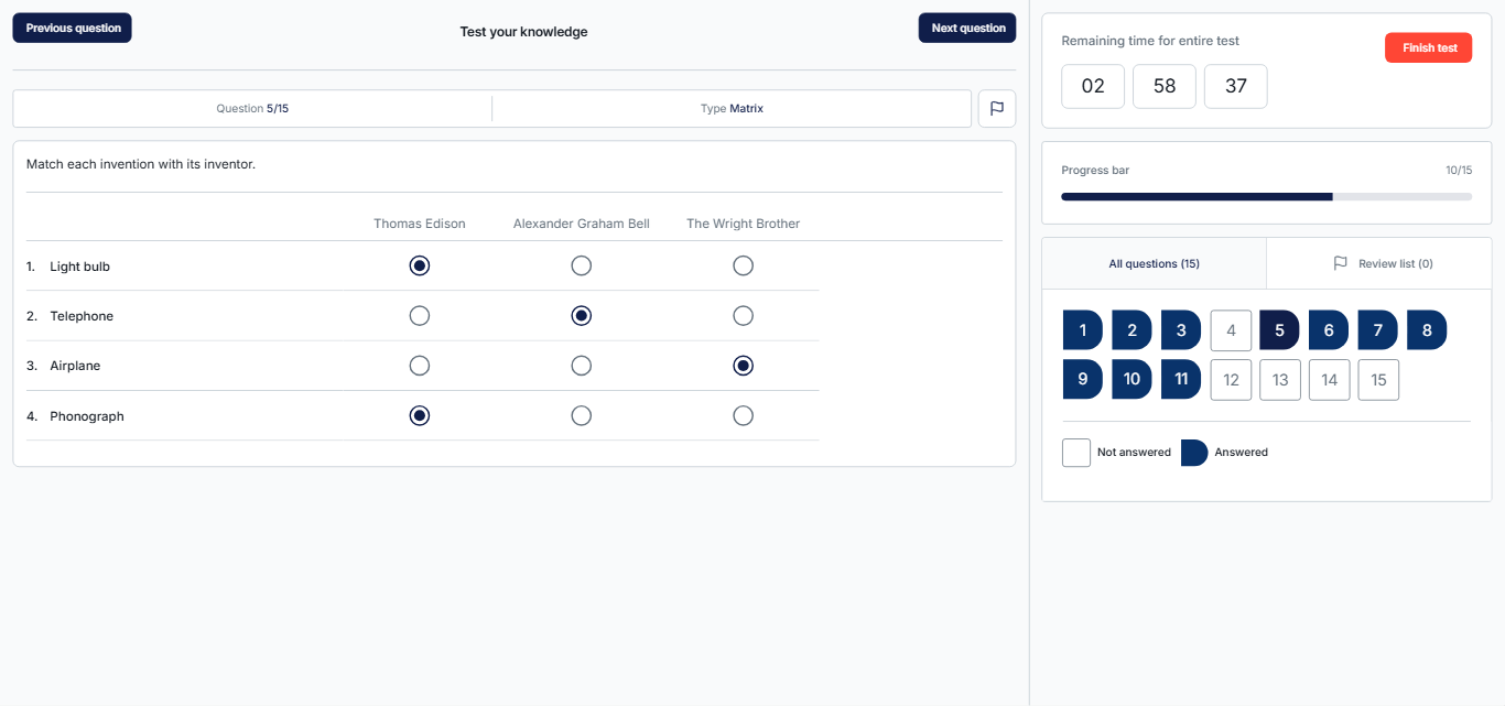 Matrix questions consist of a grid of multiple-choice questions presented in rows and columns. Each row represents a different question, while columns provide predefined answer choices.