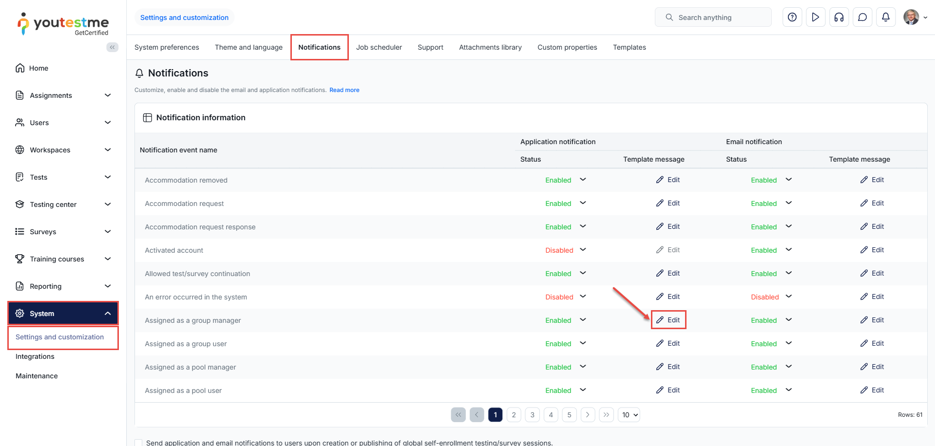 To customize notifications, go to System → Settings and Customization → Notifications. From this tab, select the Edit button next to the notification you wish to modify. Here, you can adjust the content, enable or disable specific notifications, and personalize them to suit your preferences.