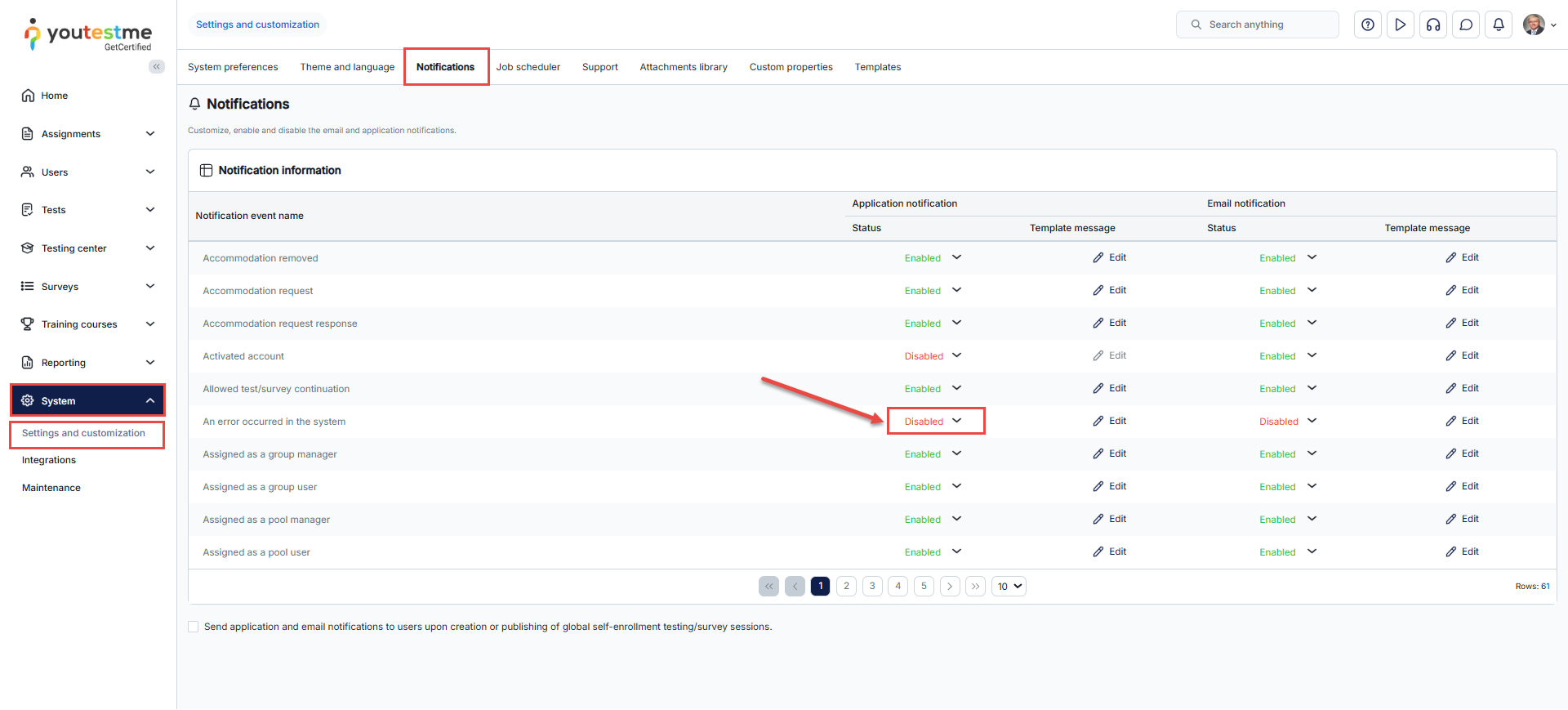 To customize notifications, go to System → Settings and Customization → Notifications. From this tab, select the Edit button next to the notification you wish to modify. Here, you can adjust the content, enable or disable specific notifications, and personalize them to suit your preferences.