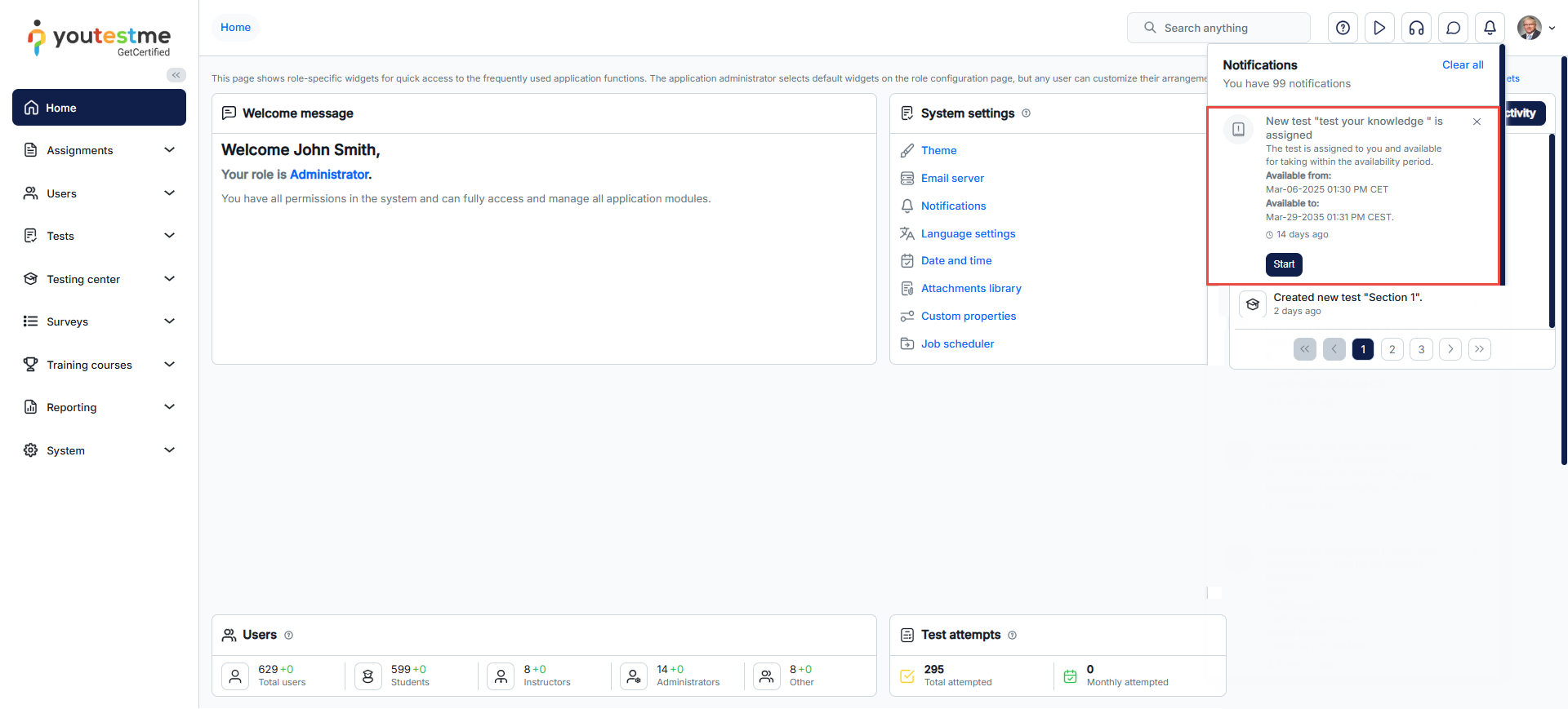 • Application Notifications – displayed within the GetCertified platform while users are logged in, providing real-time alerts about activities such as test assignments or updates.