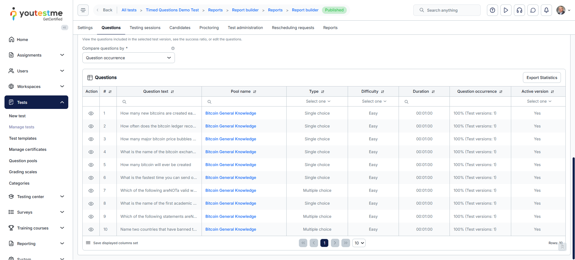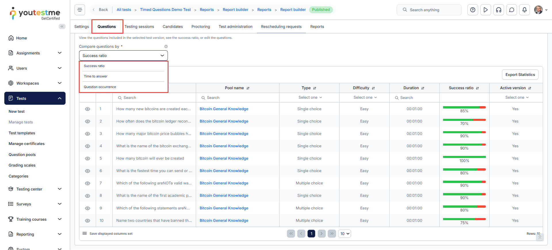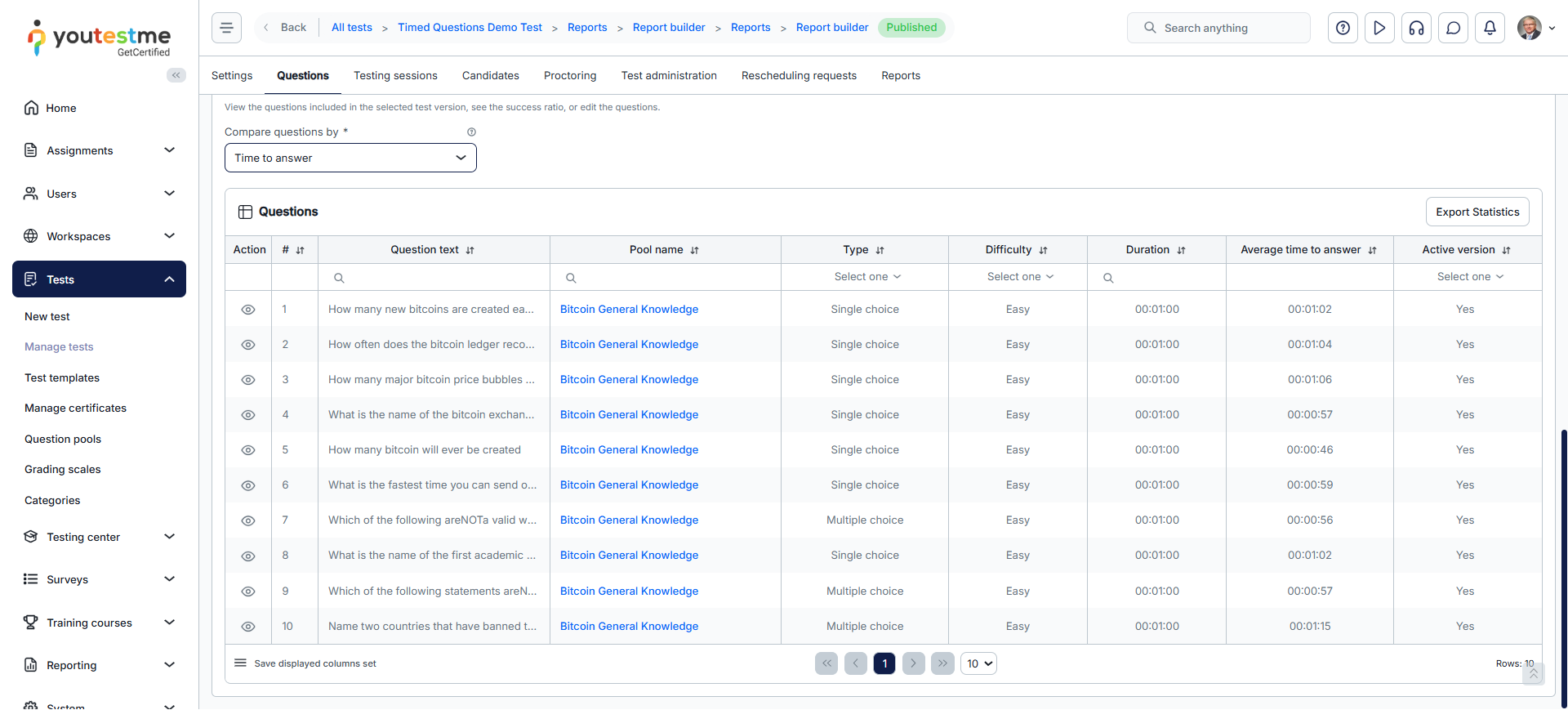 - Question Statistics: This report displays question text, difficulty level, appearance frequency, average score, response time, and more.