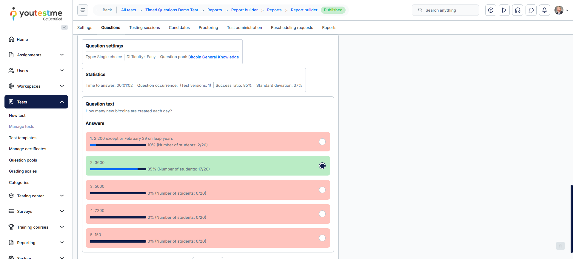 Answers statistics: Users can view detailed statistics for a question’s answers by clicking the Details button in the Actions column for that question. This includes the number of correct and incorrect responses, as well as the percentage of test-takers who selected each answer.