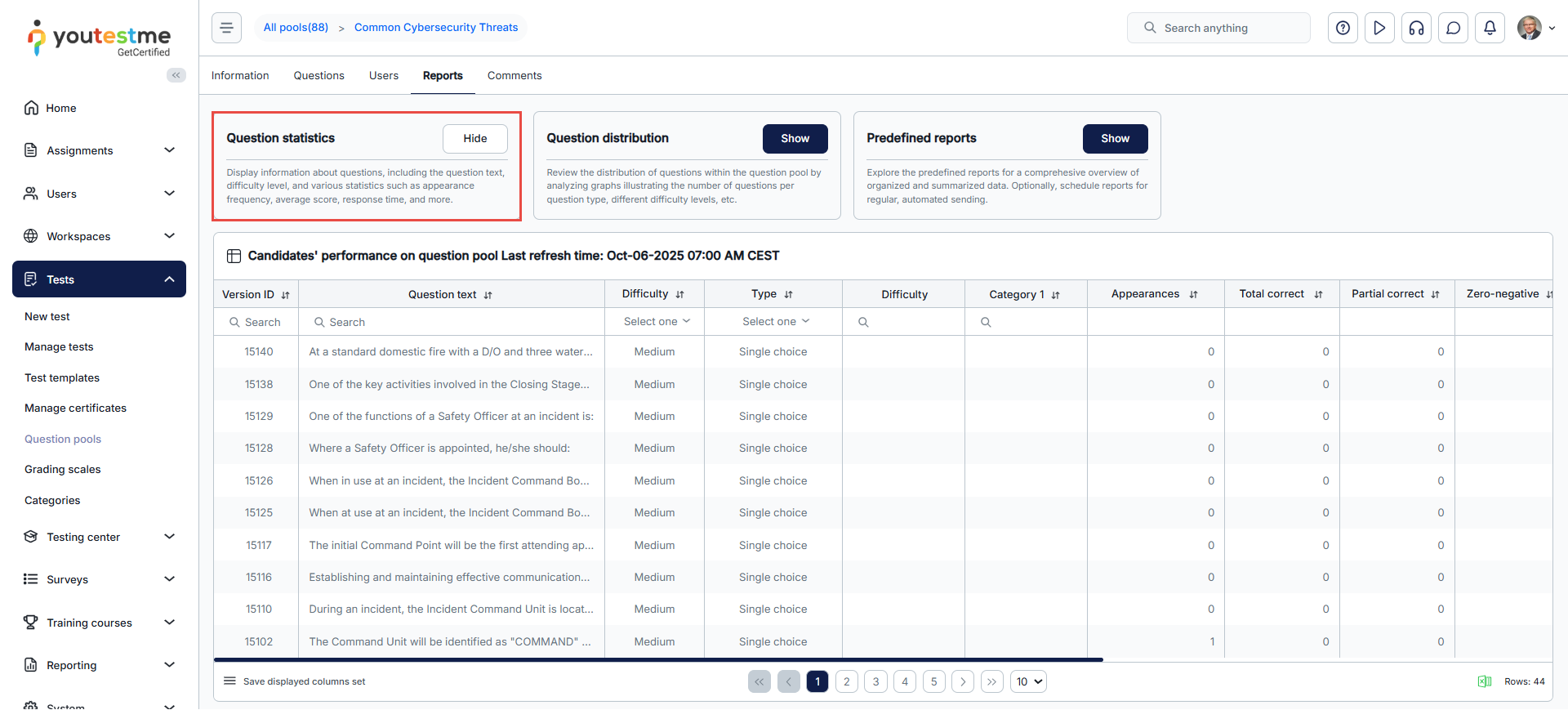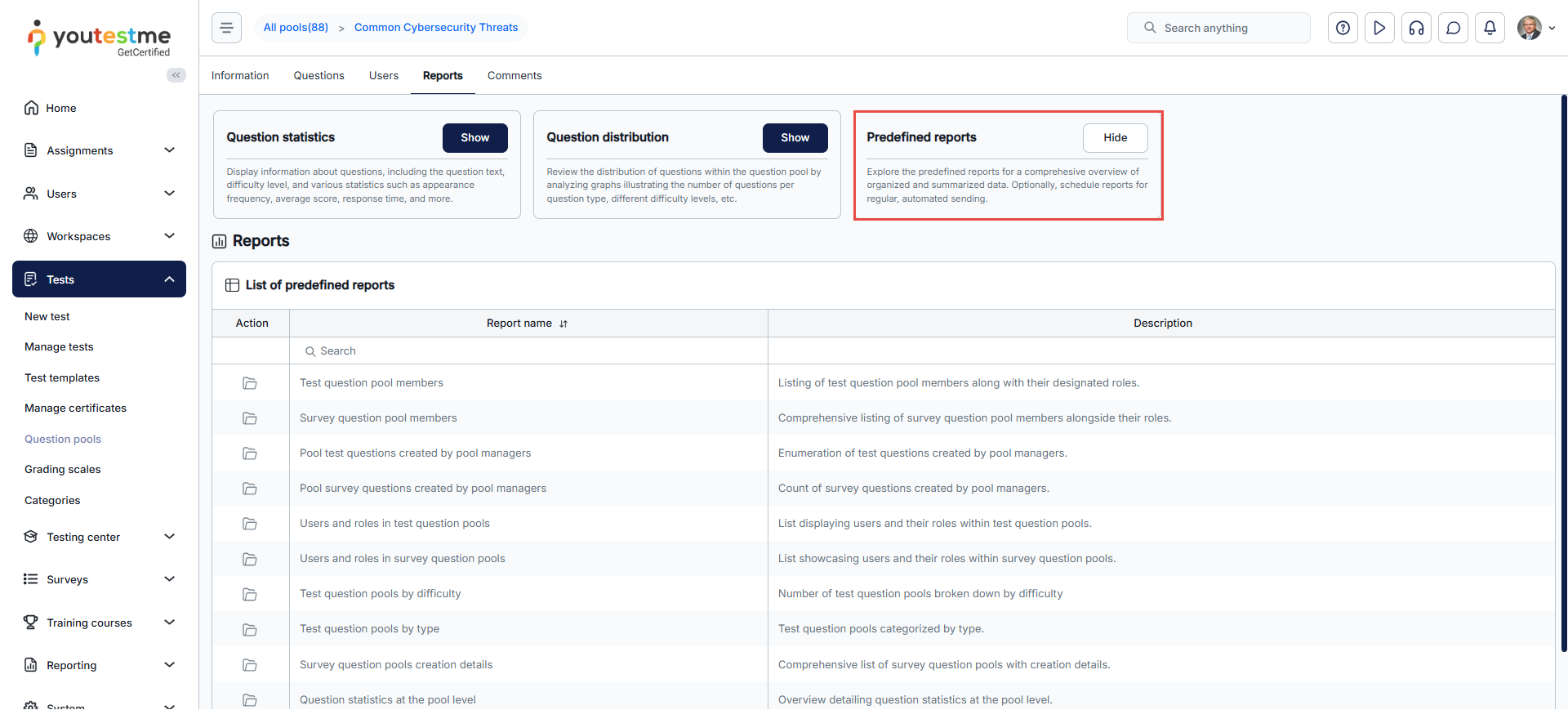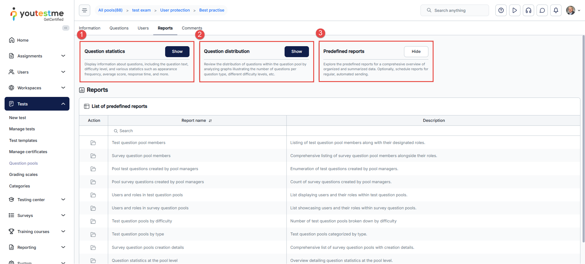 - Predefined reports: Easy access to a set of predefined Question reports for the selected question pool.