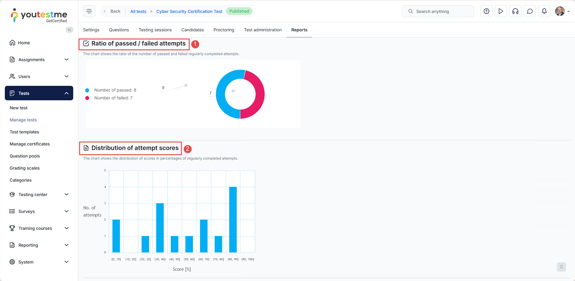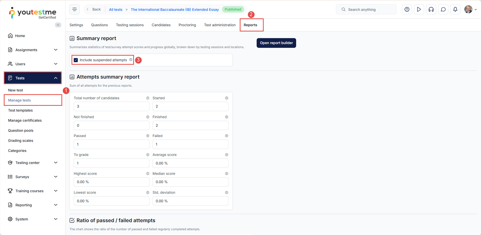This report provides access to a comprehensive overview of test attempt results and progress, both globally and segmented by testing sessions.