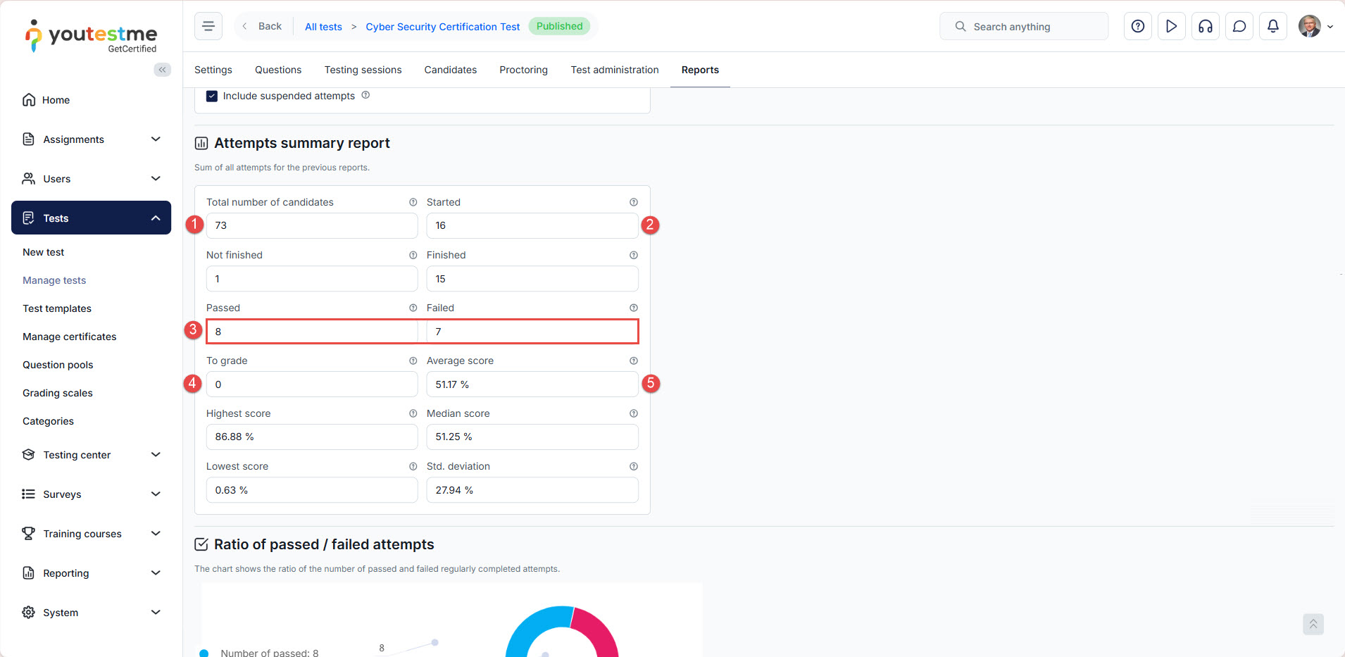 Summary Report: Provides insights into the average and median scores, standard deviation, exam success ratio, and enables result comparisons across different sessions and testing locations.