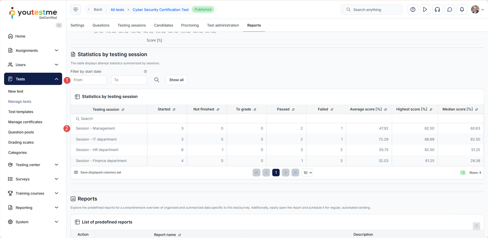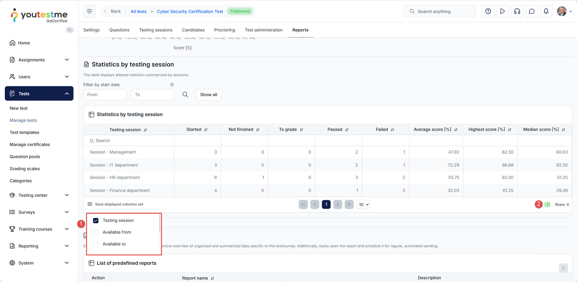 Alongside the global report, the system generates a statistical report categorized by testing sessions, enabling you to: