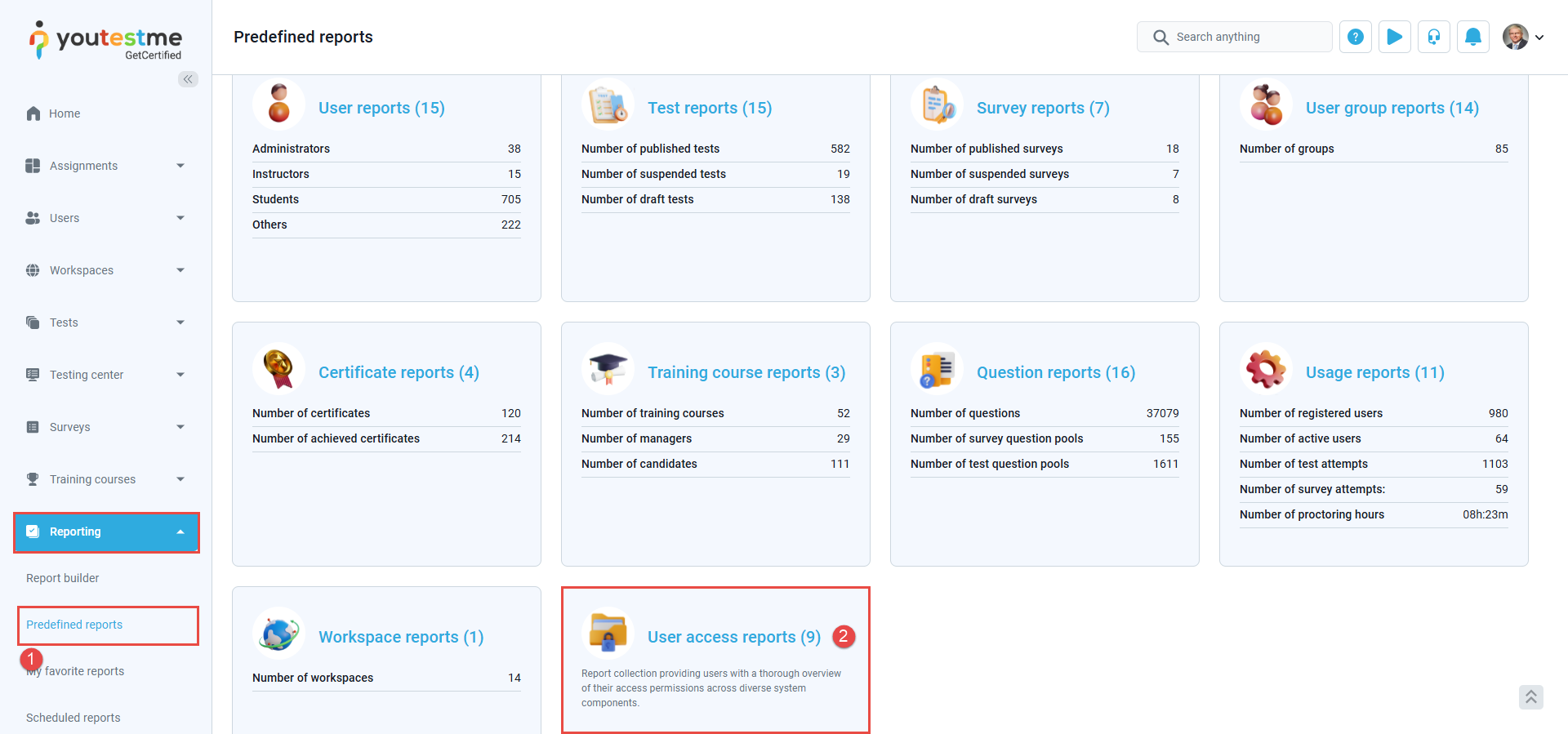 Here, you will see a list of reports on the access information on who can manage view tests/surveys, a list of users assigned to different workspaces, a list of users, and the permissions associated with their system roles. The reports can be added or removed from favorites.