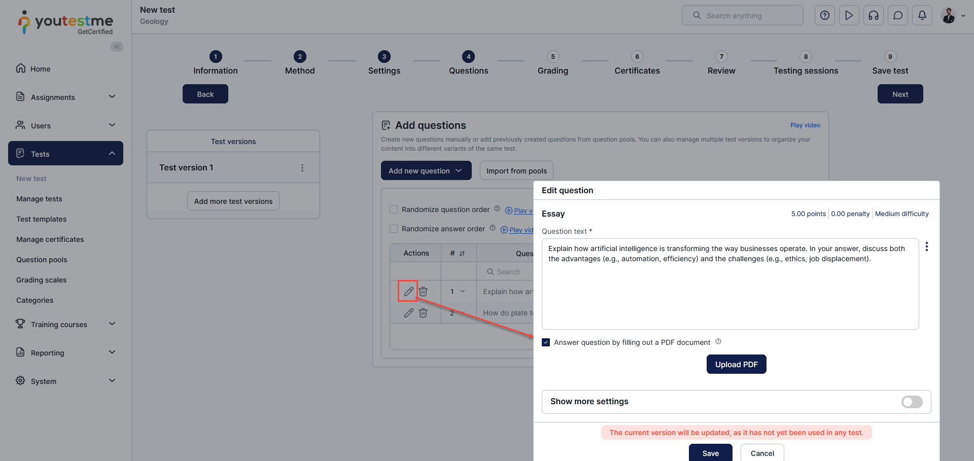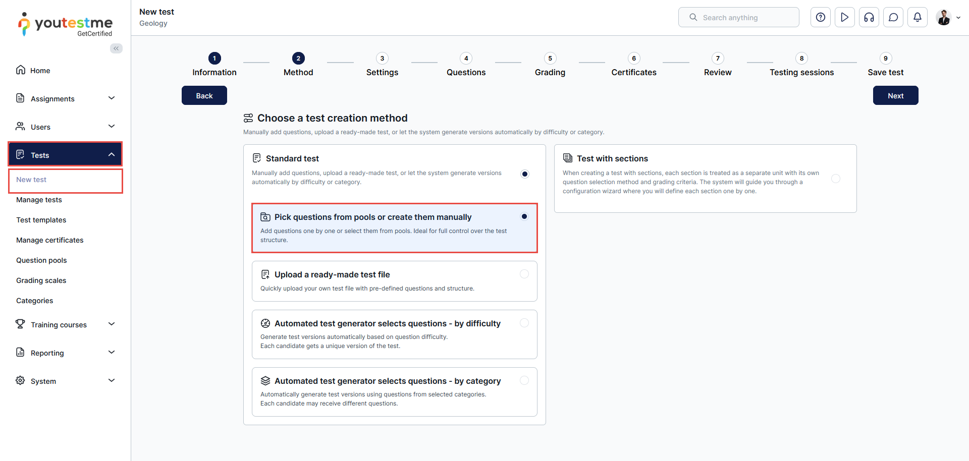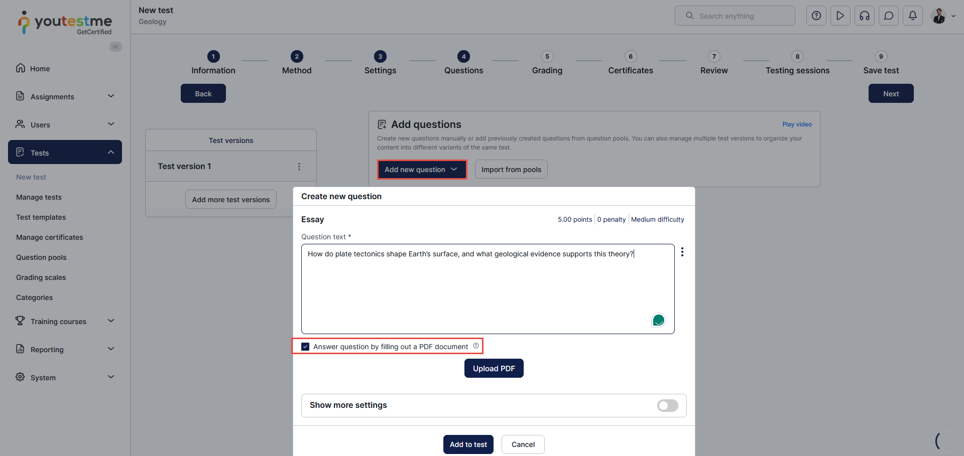 To enable the option for adding attachments for the essay question, go to the Tests/New tests tab, and on the third step in the Test creation wizard, select the Pick questions from pools or create them on the spot option.