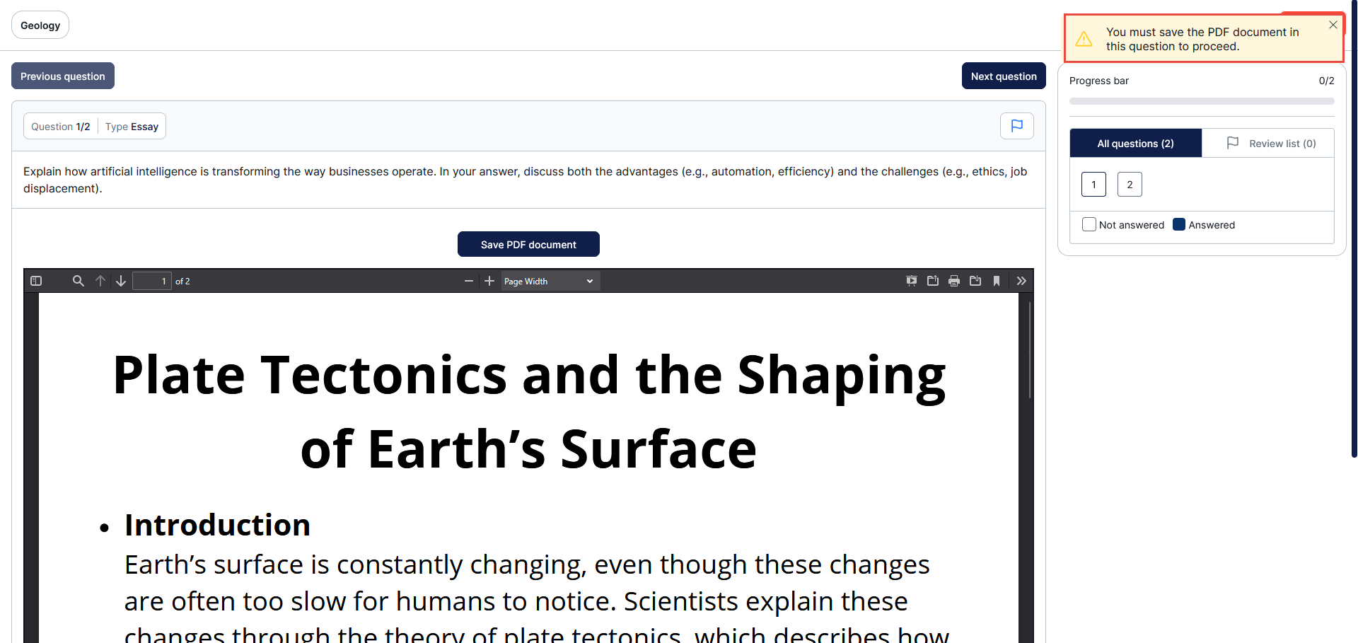 Suppose the candidates attempt to answer the essay question without uploading the attachment. In that case, the system will notify the candidate that they must provide an attachment to proceed with the exam.