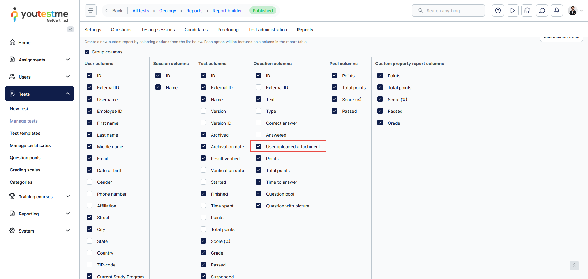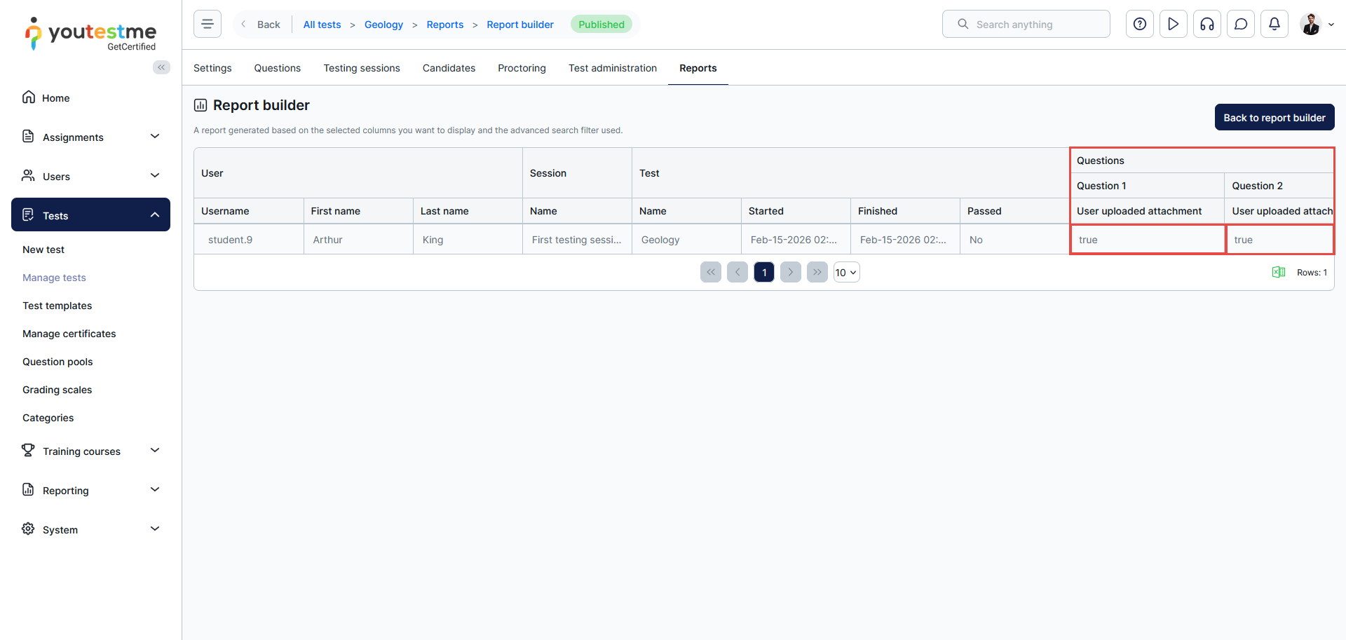 In the Manage tests/Report builder tab, you can turn the desired report columns on/off, but make sure the column User uploaded attachment is enabled. After adjusting the columns, select the displayed report.