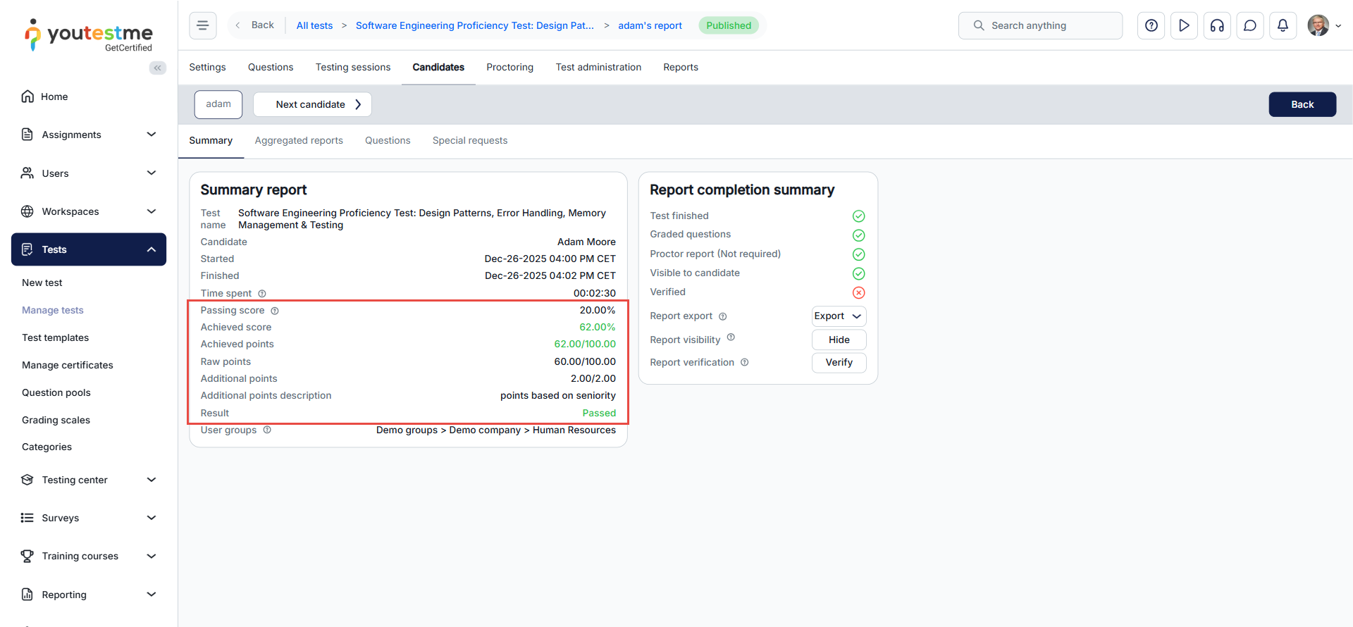 In the candidate’s personal test report, additional points are displayed prominently in the Summary Report section. Candidates can see: