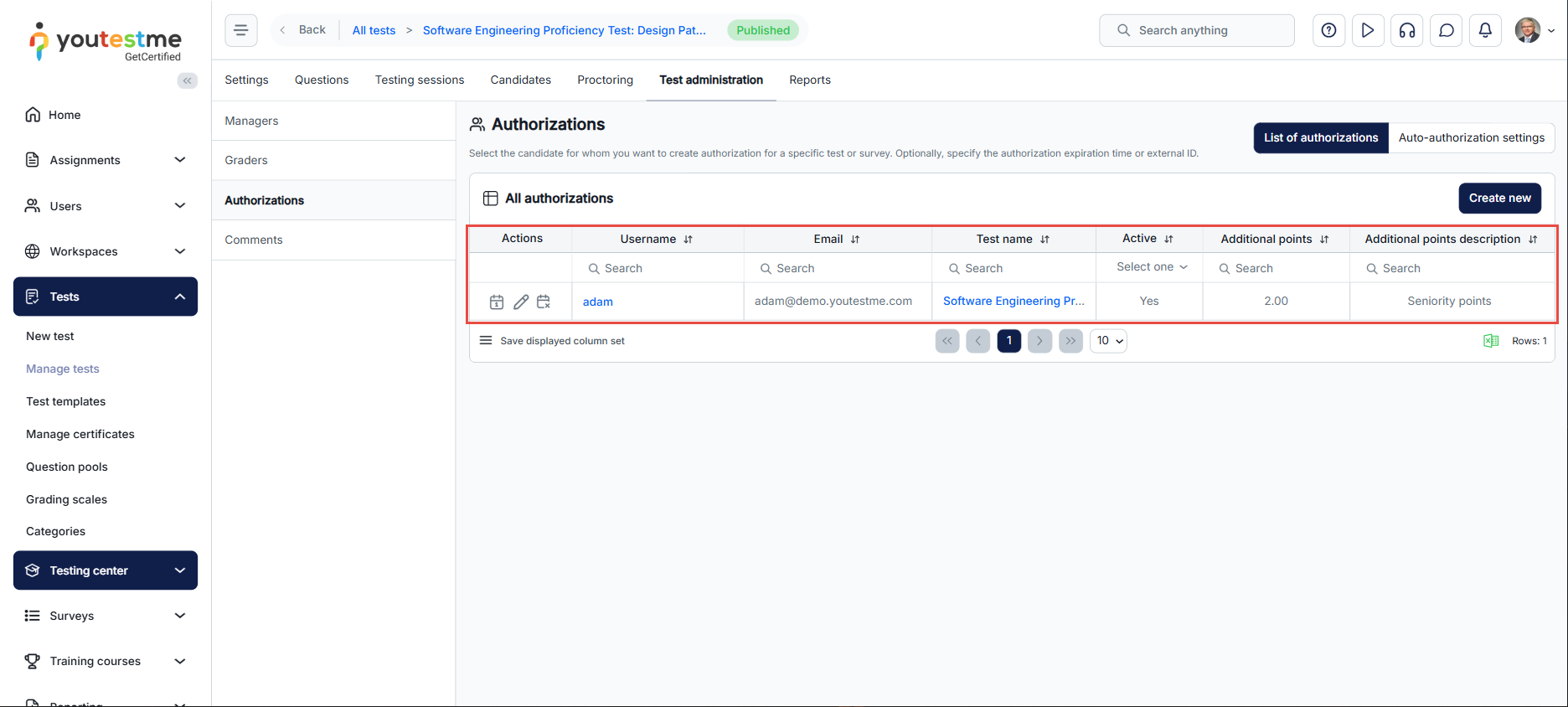 - In the Test administration menu on the left side, click Authorizations to open the authorization list.