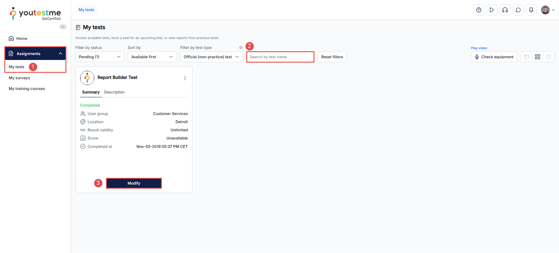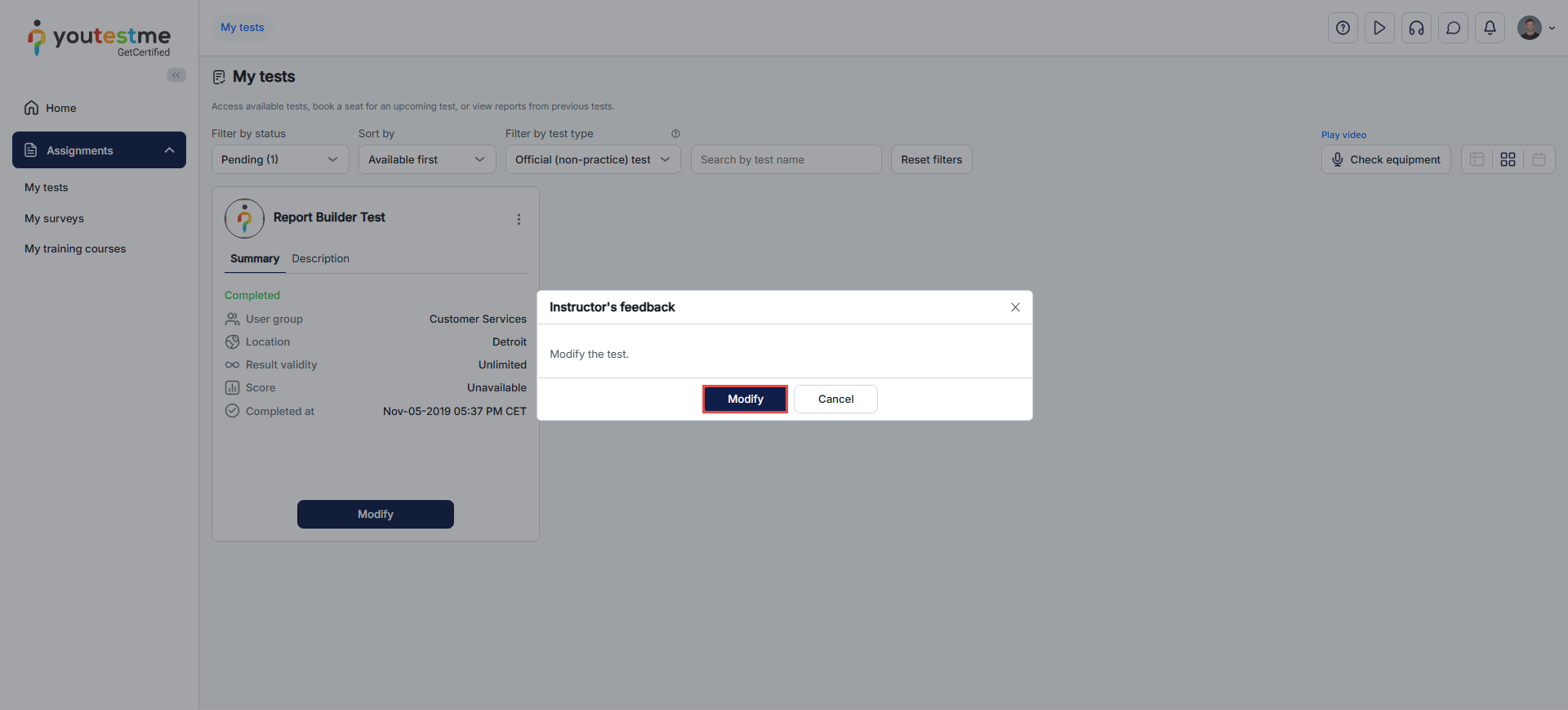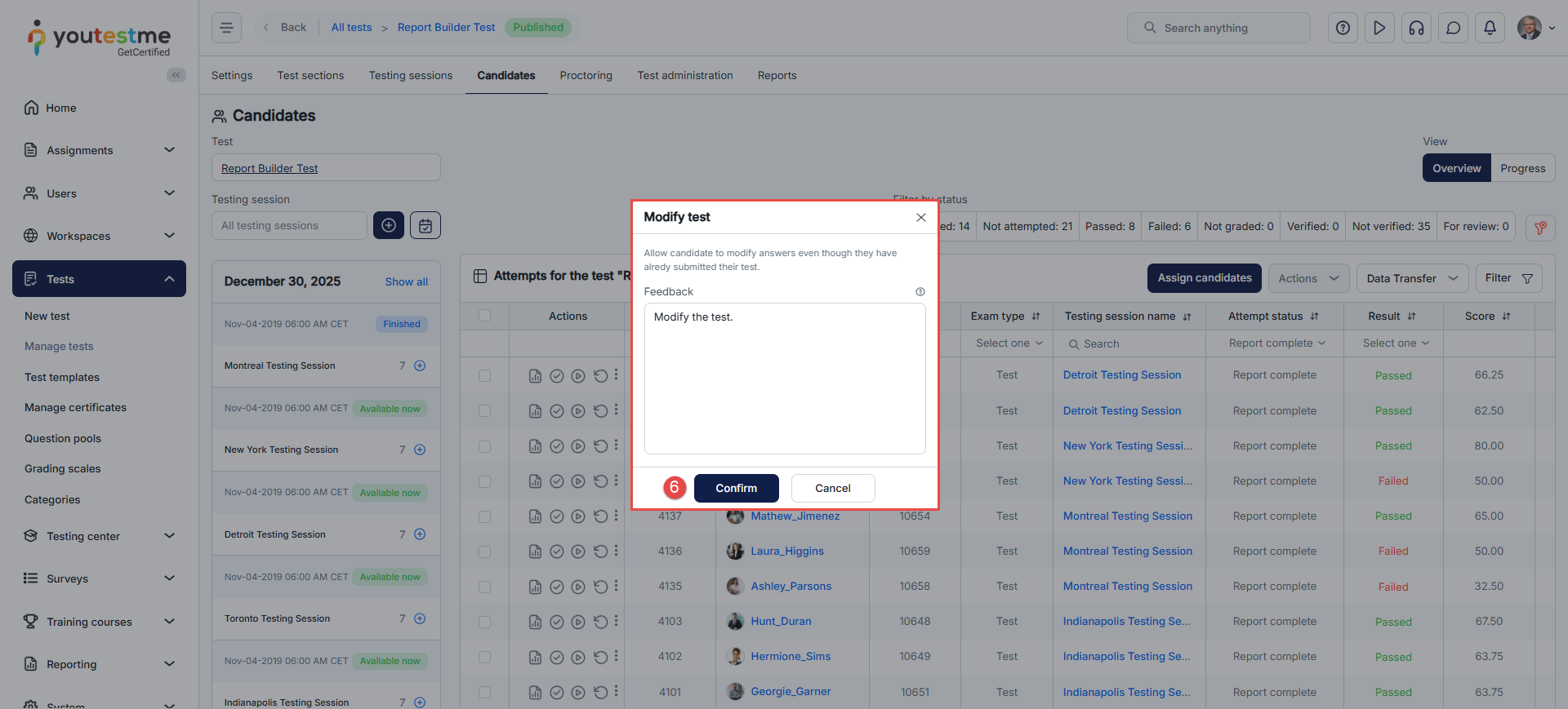 - From the Actions column, click the three dots, then select Modify to allow a candidate to modify a test.