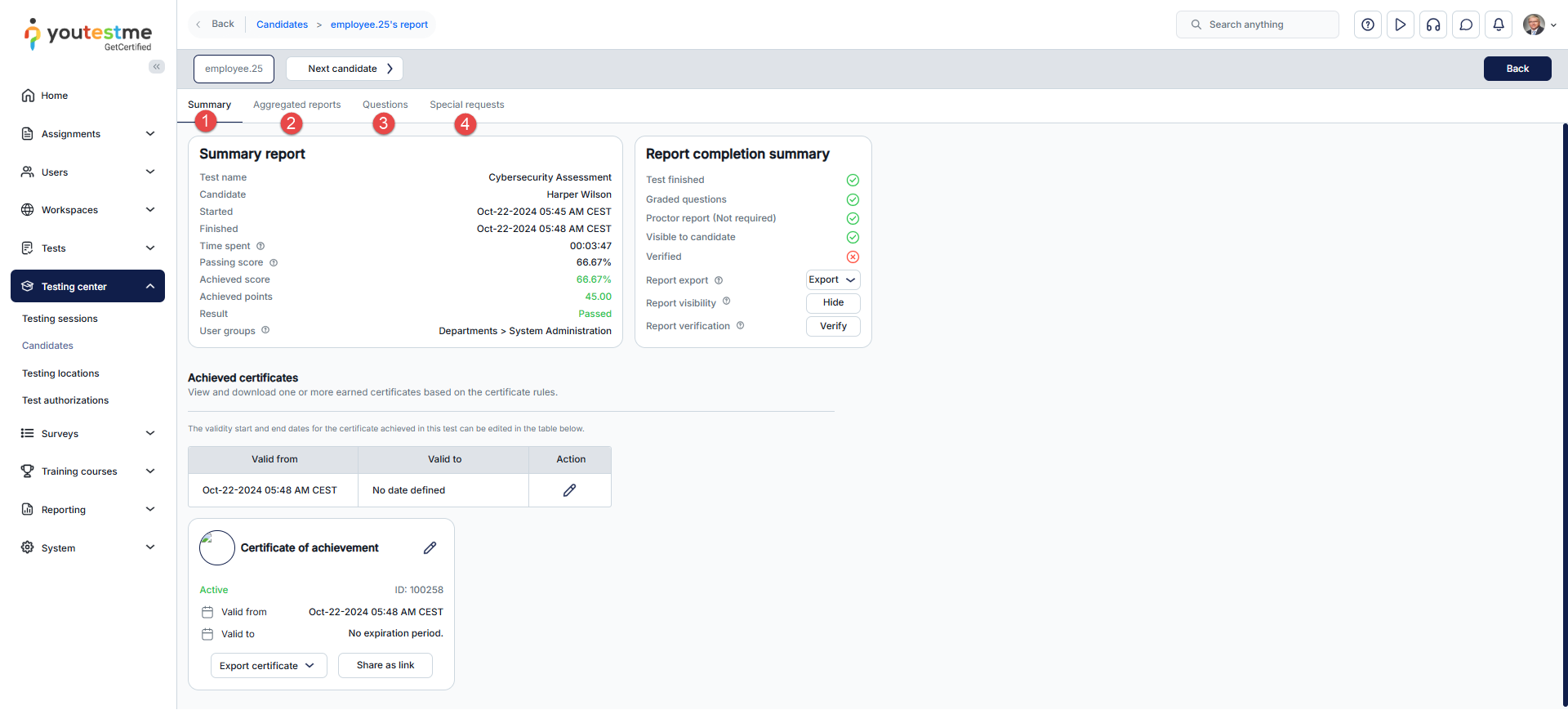 In addition to reviewing results through the Test Results report, administrators can also open an individual candidate’s Personal Report. This view is used when you need to examine a single candidate’s performance in detail, such as their time spent, score breakdown, or certificate information, rather than analyzing results across multiple candidates. It provides a focused, candidate-specific summary rather than the broader overview in the Test Results report.