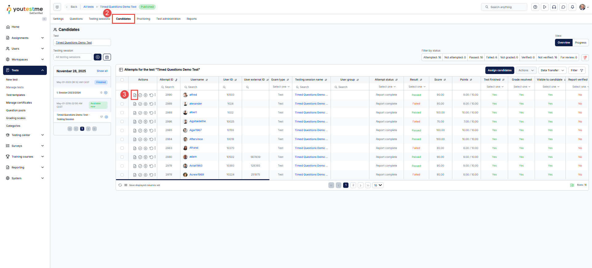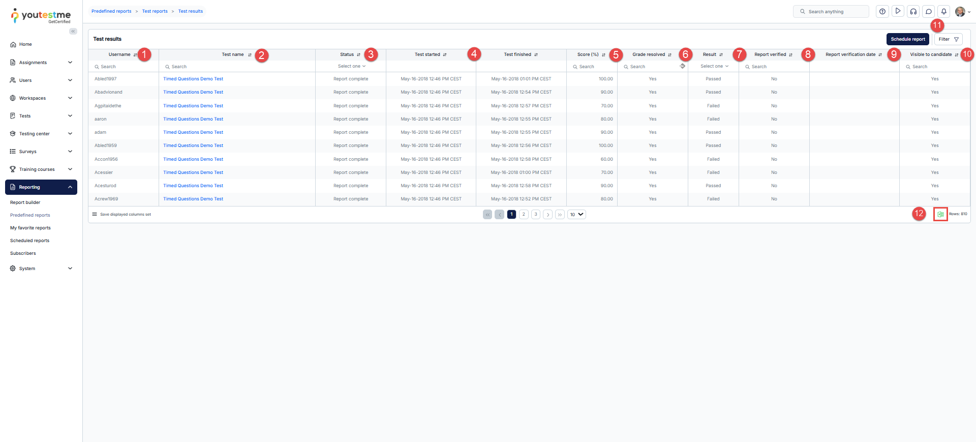 The Test Results report is a predefined report that provides an overview of candidate performance across one or more tests. It allows administrators to quickly review attempt statuses, completion progress, scores, and verification details in a single table.