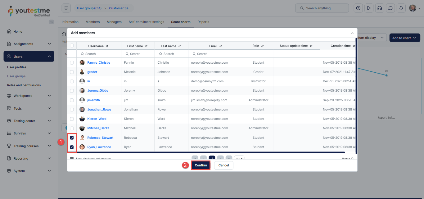 To create a score chart for a user group, first access the desired user group, then configure the chart settings.