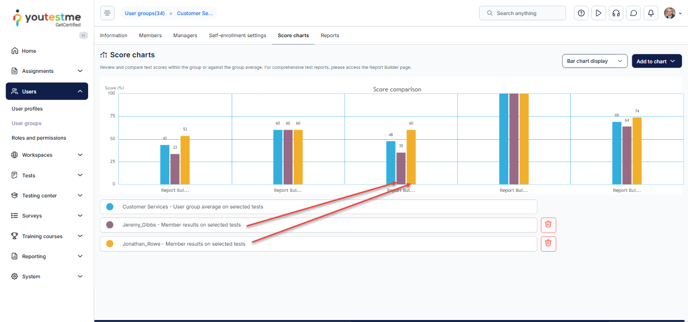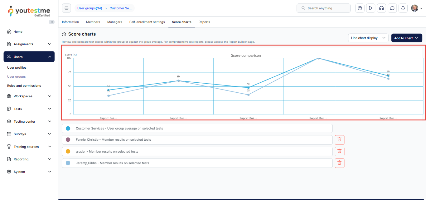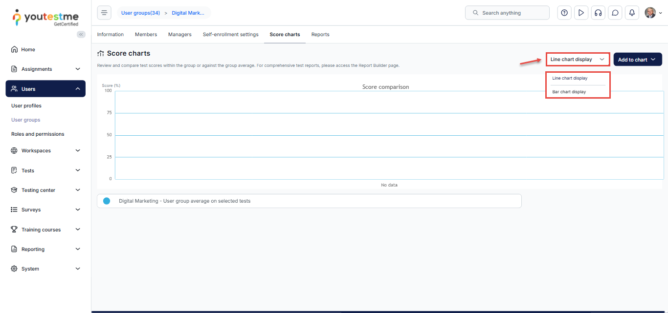 This article explains how to analyze User Group Scores Charts in YouTestMe. These charts enable you to visualize and compare the performance of specific user groups based on selected tests, surveys, or individual group members, using linear or bar chart views for clear interpretation of results.