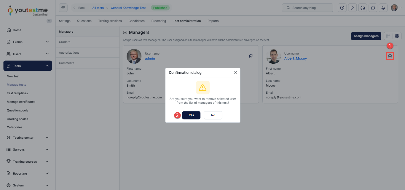 This article explains how to assign or remove Test Managers for a test. Test Managers have full administrative access to the assigned test, allowing them to configure test settings, monitor attempts, review results, and manage the overall testing process. This is useful when multiple users need shared responsibility for managing a test.