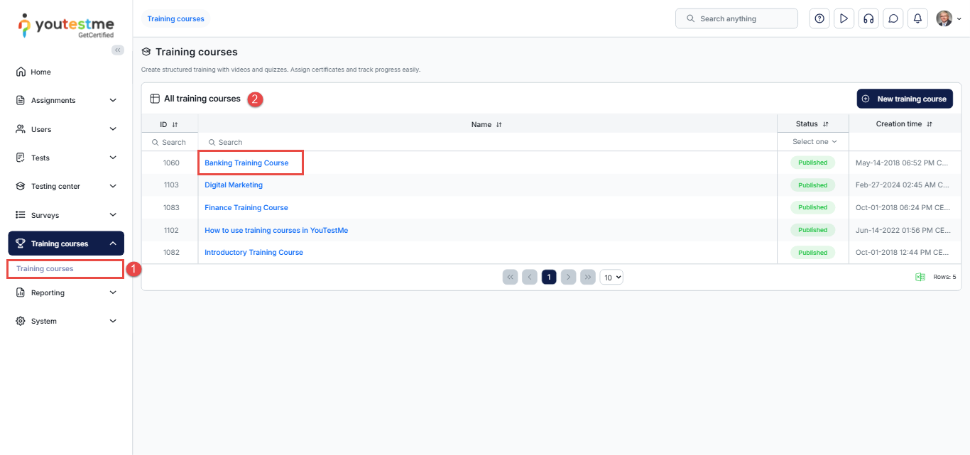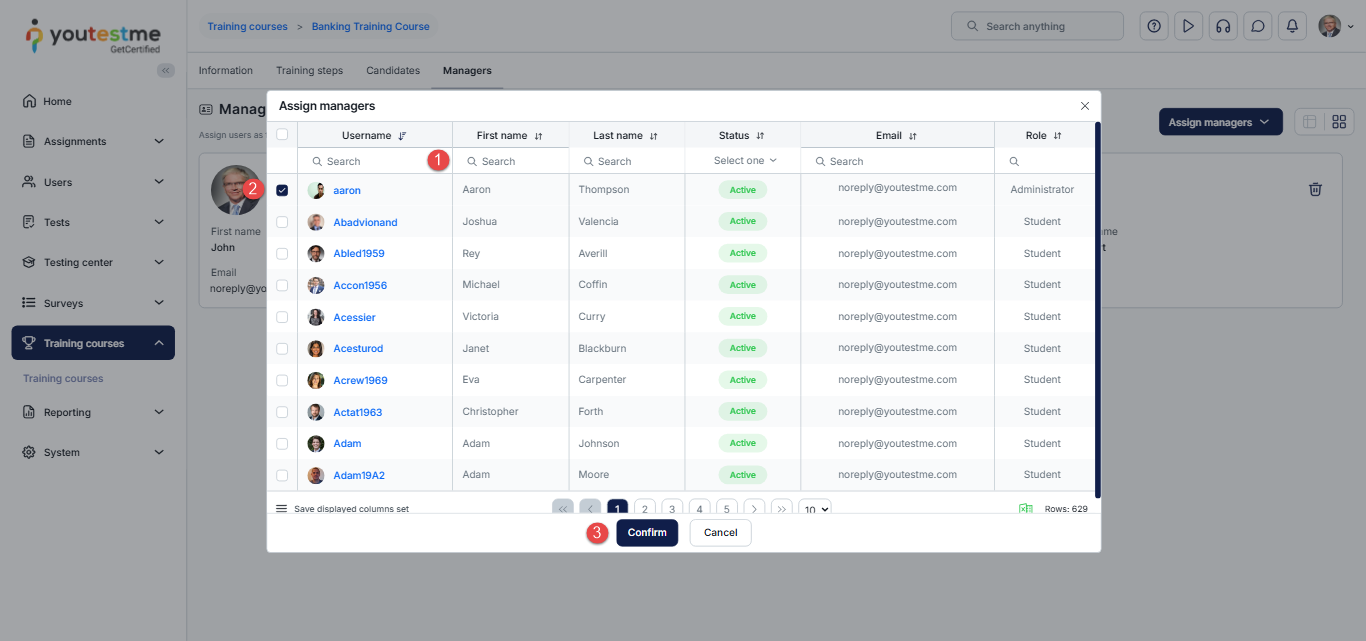 This article explains how to assign a manager to a training course. A training course manager can add steps and training course materials and assign tests, or ad-hoc tests, to the training course. Moreover, they can assign candidates to a course and manage the roles of other application users.