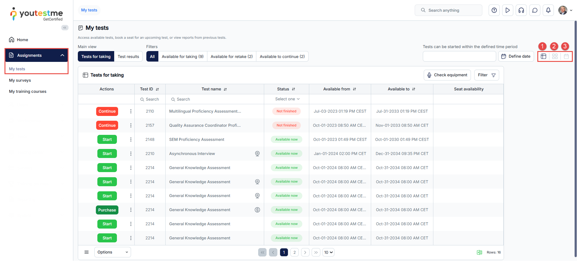 On the My Tests page within the Assignments module, candidates can view their tests in three different layouts: