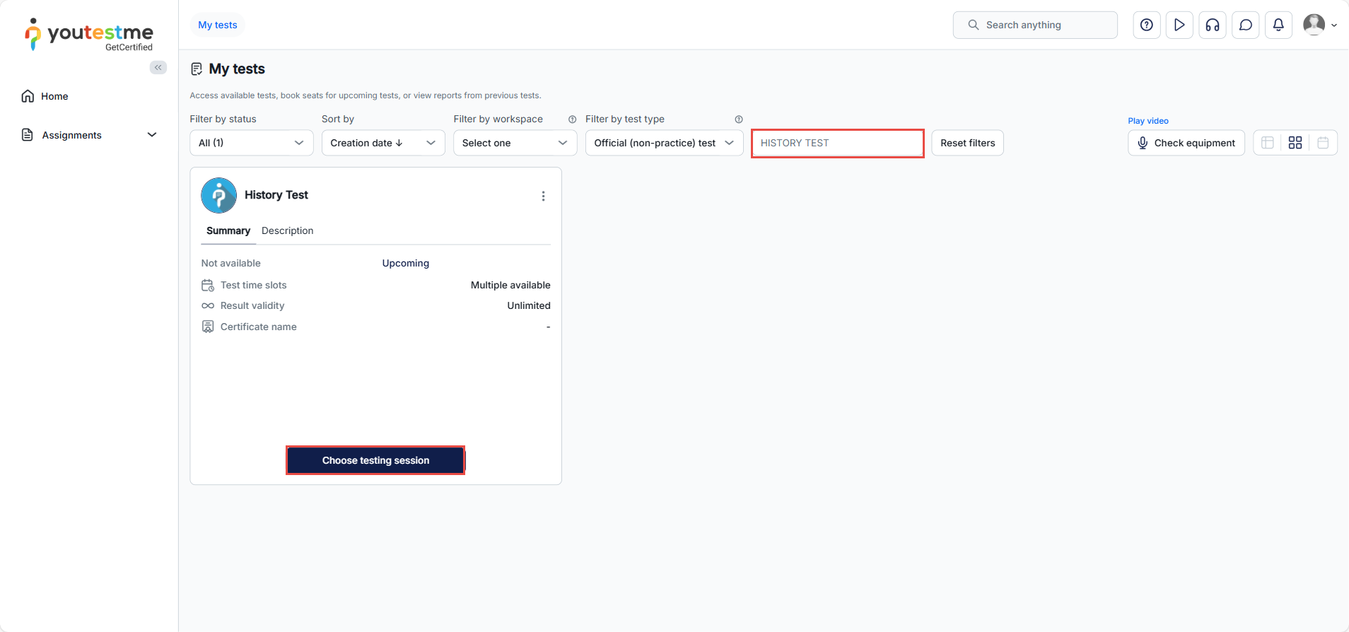 This article explains how candidates can book a test in YouTestMe GetCertified, outlining where to find assigned tests and how to use the available views to select a testing session and book a test.