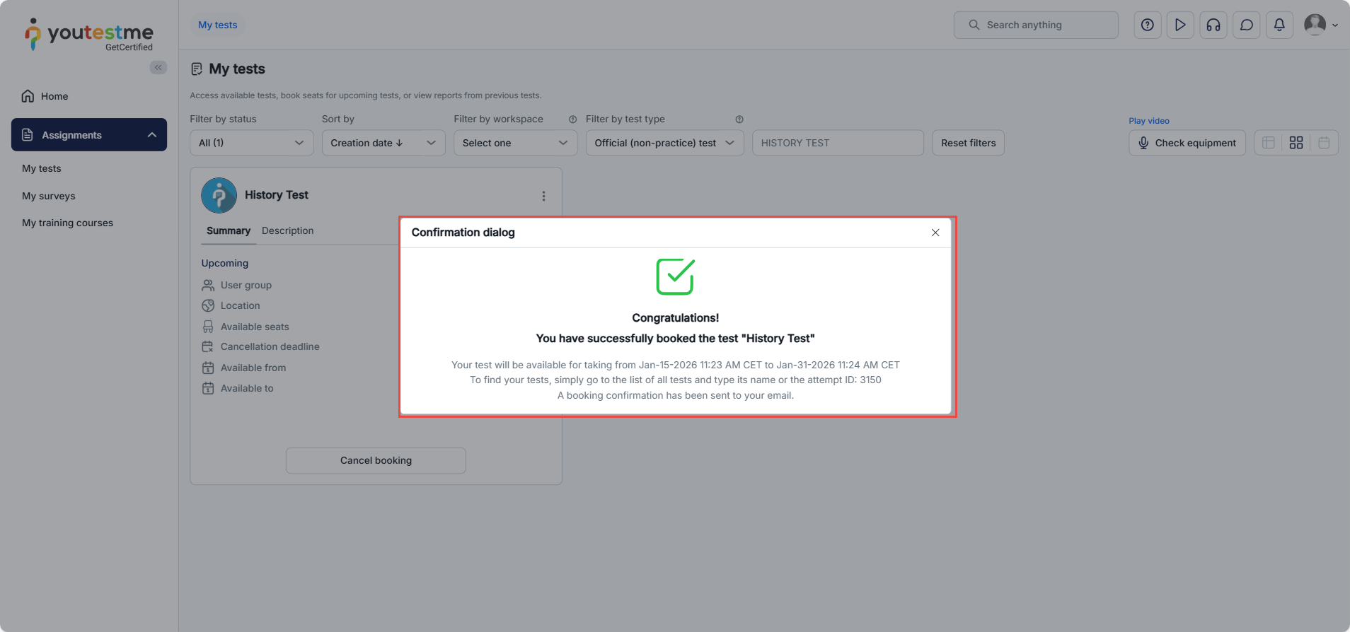Once the booking is confirmed, the test will be reserved for the defined time period and will be available to start within that window.