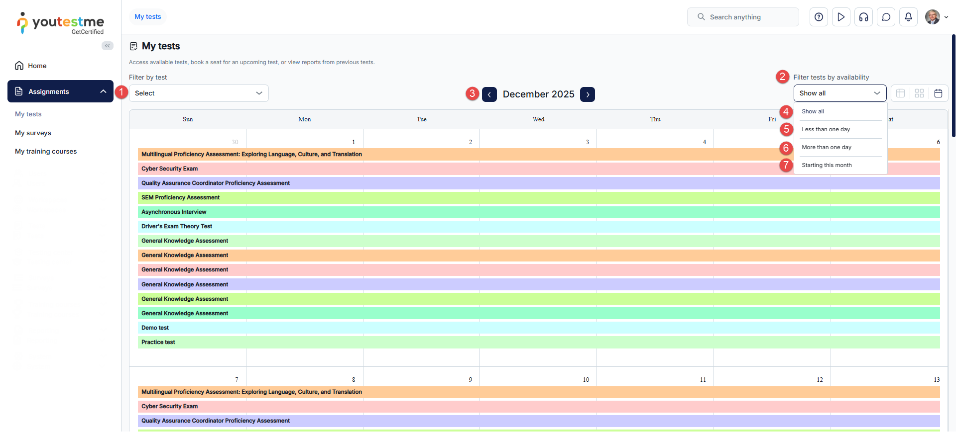 This article explains how candidates can book a test in YouTestMe GetCertified, outlining where to find assigned tests and how to use the available views to select a testing session and book a test.