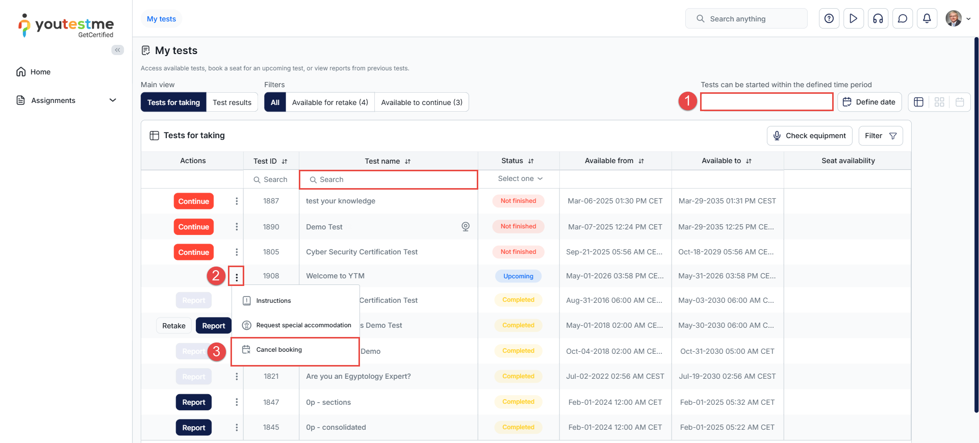- In the My Tests tab, locate the test’s status, availability, or search for it by name.